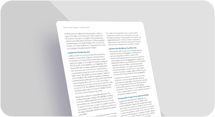 Diversity comes of age as an investment theme disability (mental or physical) and geography. Failure to The social case for greater inclusion is clear and there support DEI takes many forms and is often unintentional, is significant academic evidence aligning it to stronger 5 although it’s important to recognise that legal provisions financial performance . Consequently, many investors now exist, but sometimes prove a hindrance. Formal recognition regard limited gender diversity in investee companies as of diversity types, and understanding of the causes of non- a risk and have raised their expectations on the extent to inclusion, can foster development of appropriate processes which diversity is integrated into investment decisions. and strategies that embed greater inclusion. Corporate diversity data nearing critical mass Lessons from the last two years Data providers and investors are increasingly screening Looking at how the Covid pandemic affected diversity companies for diversity information, requiring greater progress brings the lack of gender diversity back into disclosure. Regulators are likely to reinforce the the spotlight as this period had a particularly adverse requirement for greater disclosure (see later section). We impact on women. A study from The Lancet covering the expect required data to be aggregated at company and first 18 months of the pandemic up to September 2021 board levels at the very least, with periodic and consistent showed that 26% of women experienced “employment reporting. Companies failing to provide appropriate loss” versus just over one in five men.2 Similar findings disclosures, strategic focus or meet certain thresholds of increased job losses for women came from a World may find themselves “screened” out or “voted against”. Bank3 report. The added burden on women of caring for However, diversity is a complex topic and there are data- others resulted in the pandemic experience widening a access hurdles facing investors in certain geographies. persistent employment gap. According to the International Engaging with companies on diversity issues is often Labour Organisation (ILO)4, the current global labour force participation rate for women is just under 47%, while necessary to overcome these obstacles and better for men it’s 72%. This difference of 25 percentage points understand an organisation’s diversity profile, strategic extends in some regions of Africa, the Middle East and focus and governance of the topic. The information South Asia above 50 percentage points. investors seek typically includes formal strategy statements, clear processes, board member responsibility, Beyond the employment gap is the salary gap. The a link to compensation and, where required, pathways to unadjusted pay gap averages 20% globally, according strengthen a company’s position. to the ILO. Yet this understates how much less women are paid because it does not take into account a range Driving positive change through active stewardship of relevant factors such as type of occupation, education Engagement takes place either bilaterally or in and experience that might give a truly accurate picture of collaboration with other investors. Allianz Global the wage differential. Data for this “adjusted” pay gap is Investors (AllianzGI) actively uses its proxy voting rights very limited. and usually votes against re-election of the chair of the The key question arising from the experience of women nominations committee of large-capitalisation companies in the pandemic is: if progress on gender diversity was in developed markets if women make up less than 30% of the board.6 We also expect nationality and ethnic diversity challenged, how much more difficult was it for other under-represented groups to advance? Answering this to appropriately reflect a business’s geographic footprint question fully requires broader and more granular data. and employee and customer profile. For example, But the issue leads to a more general point: it’s logical to AllianzGI would not support re-election of the chair of a assume that equality of access and opportunity for all large-cap listed US company’s nominations committee groups could narrow the labour force’s current gaps in if there was not at least one board member from an skills and employment. under-represented ethnic group. This rule will also be implemented in the UK next year. The evolution of diversity as an investment theme Collaborative engagement is also a powerful tool. In Investors now take a holistic view of sustainability 2021, AllianzGI joined the 30% Club Investor Group in concerns, expecting that issues such as diversity are France, which aims to increase female representation at embedded into the values of asset management firms. leadership levels of large listed domestic companies. Increasingly, asset managers are using publications like sustainability or stewardship reports to disclose their own The role of regulation diversity data as well as how they have engaged with Regulation on diversity is evolving. A growing number investee companies and cast proxy votes on this issue. of states in the US and the EU now insist on a minimum 2. L S Flor, J Friedman, C N Spencer, J Cagney, A Arrieta, M E Herbert et al, Quantifying the effects of the COVID-19 pandemic on gender equality on health, social, and economic indicators: a comprehensive review of data from March, 2020 to September 2021, The Lancet, March 2022 https://www. thelancet.com/journals/lancet/article/PIIS0140-6736(22)00008-3/fulltext 3. World Economic Forum, Global Gender Gap Report, March 2021 https://www3.weforum.org/docs/WEF_GGGR_2021.pdf 4. International Labor Organization, The gender gap in employment: What’s holding women back? February 2022 https://www.ilo.org/infostories/ en-GB/Stories/Employment/barriers-women#intro 5. An example is McKinsey, Delivering through diversity, January 2018, https://www.mckinsey.com/business-functio