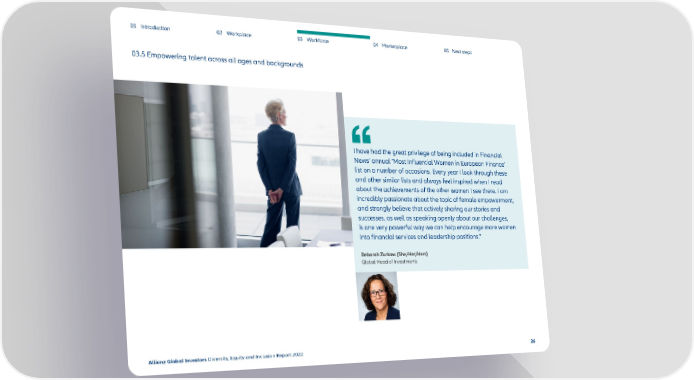 01 Introduction 02 Workplace 03 Workforce 04 Marketplace 05 Next steps 03.5 Empowering talent across all ages and backgrounds I have had the great privilege of being included in Financial News’ annual ‘Most Influential Women in European Finance’ list on a number of occasions. Every year I look through these and other similar lists and always feel inspired when I read about the achievements of the other women I see there. I am incredibly passionate about the topic of female empowerment, and strongly believe that actively sharing our stories and successes, as well as speaking openly about our challenges, is one very powerful way we can help encourage more women into financial services and leadership positions.” Deborah Zurkow (She/Her/Hers) Global Head of Investments Allianz Global Investors Diversity, Equity and Inclusion Report 2022 26