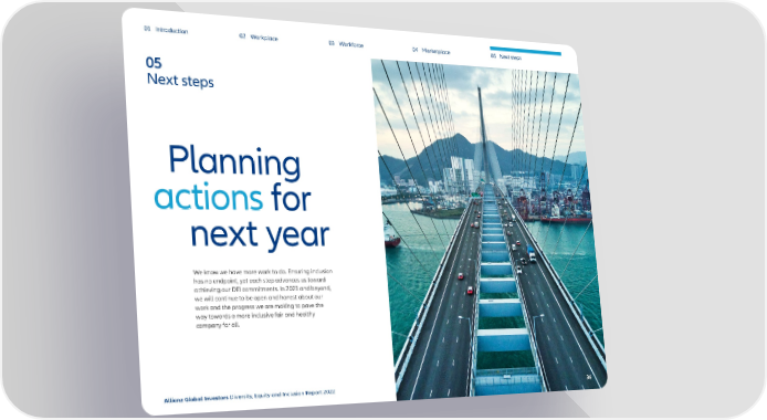 01 Introduction 02 Workplace 03 Workforce 04 Marketplace 05 Next steps 05 Next steps Planning actions for next year We know we have more work to do. Ensuring inclusion has no endpoint, yet each step advances us toward achieving our DEI commitments. In 2023 and beyond, we will continue to be open and honest about our work and the progress we are making to pave the way towards a more inclusive fair and healthy company for all. Allianz Global Investors Diversity, Equity and Inclusion Report 2022 3636