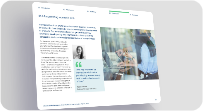 01 Introduction 02 Workplace 03 Workforce 04 Marketplace 05 Next steps 04.4 Empowering women in tech HerHackathon is an online hackathon event designed for women, by women to close the gender bias in the design and development of products. Too many products carry a gender bias as they are mainly developed by men. HerHackathon tries to shift the perspective and counter underrepresentation of women in tech. For the second year in a row, AllianzGI partnered with HerHackathon, to bring young female IT professionals together to develop solutions for problems posed by partnering companies. The catch: they only have 72 hours. Four teams went for our challenge with members of the AllianzGI team mentoring them. The winning team – “Run the code” – proposed an application which would allow users to import their existing portfolios and banking data into one app, I was very impressed by giving them an overview of their financials the creative solutions the and ensuring strong data protection. Their proposal then went up against other participating teams came up favourites from partnering companies and with in such a short amount the winners were chosen. Although Run of time.” the code did not win, AllianzGI was able to source some great ideas and present our company as an attractive employer to Yoana Ivanova female STEM professionals. Business Manager TOP Office Allianz Global Investors Diversity, Equity and Inclusion Report 2022 35