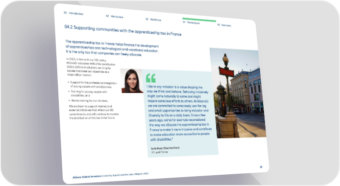 01 Introduction 02 Workplace 03 Workforce 04 Marketplace 05 Next steps 04.2 Supporting communities with the apprenticeship tax in France The apprenticeship tax in France helps finance the development of apprenticeships and technological and vocational education. It is the only tax that companies can freely allocate. In 2022, in line with our DEI policy, AllianzGI allocated 44% of its contribution (2021: 26%) to institutions working for causes that meet our objectives as a responsible investor: • Support for the professional integration I like to say Inclusion is a value shaping the of young people without diplomas; • Training for young people with way we think and behave. Behaving inclusively disabilities; and might come naturally to some and might • Home training for sick children. require conscious efforts to others. At AllianzGI We are keen to support internal and we are committed to consciously look for big external initiatives that reflect our DEI and small opportunities to bring Inclusion and commitments and will continue to monitor Diversity to life on a daily basis. Since a few the distribution of this tax in the future. years ago, we’ve for example reconsidered the way we allocate the apprenticeship tax in France to make it more inclusive and contribute to make education more accessible to people with disabilities.” Ilaria Ruzzi (She/Her/Hers) HR Lead France Allianz Global Investors Diversity, Equity and Inclusion Report 2022 33