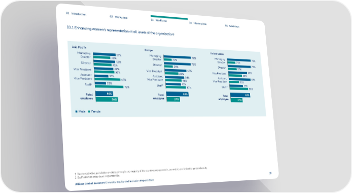 01 Introduction 02 Workplace 03 Workforce 04 Marketplace 05 Next steps 1 03.1 Enhancing women’s representation at all levels of the organization Asia Pacific Europe United States Managing 57% Managing 78% Managing 75% Director 43% Director 22% Director 25% 55% Director 76% Director 73% Director 45% 24% 27% Vice President 49% Vice President 62% Vice President 59% 51% 38% 42% Assistant 35% Assistant 54% Assistant 69% Vice President 65% Vice President 46% Vice President 31% 28% 2 43% 2 42% Staff2 72% Staff 57% Staff 58% Total 44% Total 63% Total 63% employee 56% employee 37% employee 37% Male Female 1 Due to restrictive jurisdiction on data privacy in the majority of the countries we operate in, our metrics are limited to gender diversity. 2 Staff refers to entry-level corporate title. Allianz Global Investors Diversity, Equity and Inclusion Report 2022 19