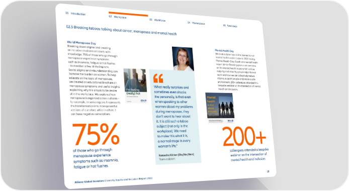 01 Introduction 02 Workplace 03 Workforce 04 Marketplace 05 Next steps 02.5 Breaking taboos: talking about cancer, menopause and mental health World Menopause Day Mental Health Day Breaking down stigma and creating We took a closer look at the intersection of an inclusive environment starts with mental health and inclusion in 2022 during knowledge. 75% of those who go through Mental Health Day. Coach and mental health menopause experience symptoms expert Janice Benning gave us an overview such as insomnia, fatigue or hot flushes on the mental health issues which various –to mention a few of the impacts. majority and minority groups might face at Social stigma and misunderstanding can work and how we can collectively reduce increase the burden on women. To help stigma, support people and create a safe educate on the topic of menopause, environment. 200+ colleagues attended this we created an educational brochure on What really surprises and bespoke webinar on the intersection of mental menopause symptoms and useful insights health and inclusion. explaining why it is a topic to be aware sometimes even shocks of in the workplace. We explored how me personally, is that even menopause is regarded across cultures – when speaking to other for example, in some regions it represents the transformation into more powerful women about my problems versions of ourselves while in others it during menopause, they can have negative connotations. don’t want to hear about it. It is still such a taboo subject (not only in the workplace). We need to make this what it is, 75% a normal stage in every of those who go through woman’s life.” 200+ menopause experience Natascha Körber (She/Her/Hers) colleagues attended a bespoke symptoms such as insomnia, Team assistant webinar on the intersection of fatigue or hot flushes. mental health and inclusion. Allianz Global Investors Diversity, Equity and Inclusion Report 2022 13