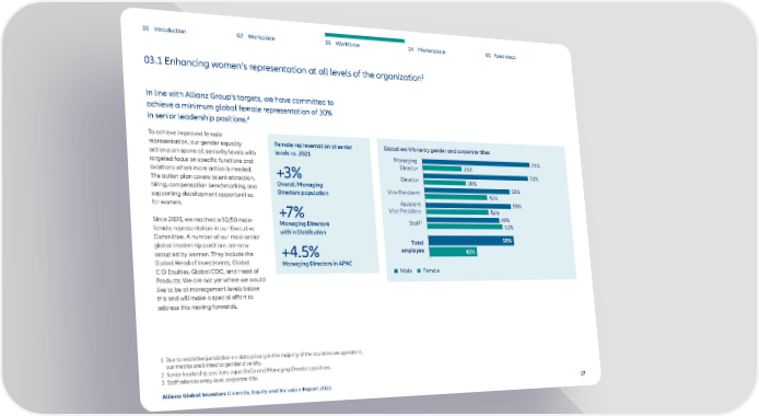 01 Introduction 02 Workplace 03 Workforce 04 Marketplace 05 Next steps 03.1 Enhancing women’s representation at all levels of the organization1 In line with Allianz Group’s targets, we have committed to achieve a minimum global female representation of 30% 2 in senior leadership positions. To achieve improved female representation, our gender equality Female representation at senior Global workforce by gender and corporate titles action plan spans all seniority levels with levels vs. 2021 Managing 74% targeted focus on specific functions and Director 26% locations where more action is needed. +3% 72% The action plan covers talent attraction, Director 28% hiring, compensation benchmarking and Overall Managing 58% supporting development opportunities Directors population Vice President 42% for women. Assistant 58% +7% Vice President 42% Since 2020, we reached a 50/50 male- Managing Directors Staff3 49% female representation in our Executive 5% Committee. A number of our most senior within Distribution global leadership positions are now Total 58% occupied by women. They include the +4.5% employee 42% Global Head of Investments, Global Managing Directors in APAC CIO Equities, Global COO, and Head of Male Female Products. We are not yet where we would like to be at management levels below this and will make a special effort to address this moving forwards. 1 Due to restrictive jurisdiction on data privacy in the majority of the countries we operate in, our metrics are limited to gender diversity. 2 Senior leadership positions equal ExCo and Managing Directors positions. 3 Staff refers to entry-level corporate title. Allianz Global Investors Diversity, Equity and Inclusion Report 2022 17