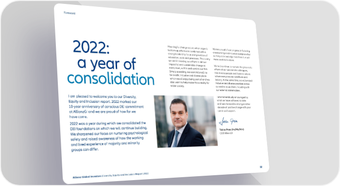 Foreword Meaningful change occurs when organic We are proud of our progress in fostering bottom-up efforts are combined with a a welcoming and inclusive workplace but 2022: strong leadership focus and provision of we fully acknowledge that there is much education, tools and processes. This is why more work to be done. we are increasing our efforts to deliver impactful and sustainable change at We will continue to nurture the grassroots a year of every level, within and outside our firm. efforts of our passionate colleagues, Simply speaking, we want AllianzGI to hire diverse people and foster a culture be a safe, inclusive and diverse place where everyone can contribute and which we all enjoy being part of and we belong. At the same time, we will embed consolidation also want to help make this a reality for inclusive and diverse practices across wider society. our entire value chain, including with our external stakeholders. I am pleased to welcome you to our Diversity, I am tremendously encouraged by Equity and Inclusion report. 2022 marked our what we have achieved to date and look forward to driving another 10-year anniversary of conscious DEI commitment decade of positive change with your at AllianzGI and we are proud of how far we continued support. have come. 2022 was a year during which we consolidated the DEI foundations on which we will continue building. We sharpened our focus on nurturing psychological Tobias Pross (He/His/Him) safety and raised awareness of how the working CEO AllianzGI and lived experience of majority and minority groups can differ. Allianz Global Investors Diversity, Equity and Inclusion Report 2022 02