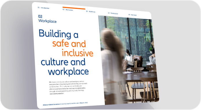 01 Introduction 02 Workplace 03 Workforce 04 Marketplace 05 Next steps 02 Workplace Building a safe and inclusive culture and workplace We foster an inclusive culture and workplace where everyone feels they belong and where they can succeed as themselves. This is why we are continuing our efforts to enhance inclusion and psychological safety through relevant practices, policies, tools, trainings and communication. Allianz Global Investors Diversity, Equity and Inclusion Report 2022 0707
