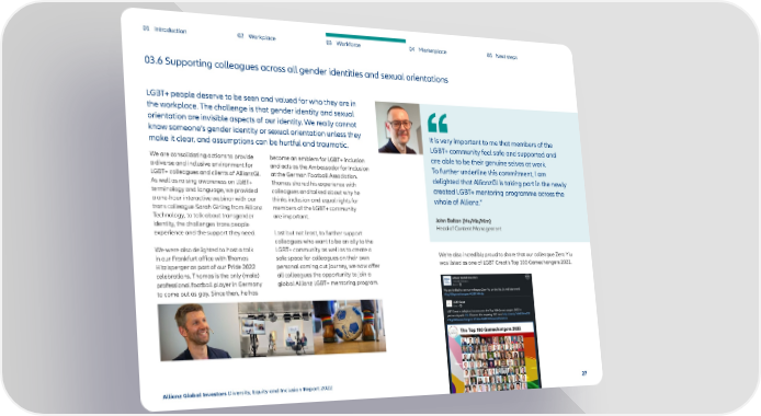 01 Introduction 02 Workplace 03 Workforce 04 Marketplace 05 Next steps 03.6 Supporting colleagues across all gender identities and sexual orientations LGBT+ people deserve to be seen and valued for who they are in the workplace. The challenge is that gender identity and sexual orientation are invisible aspects of our identity. We really cannot know someone’s gender identity or sexual orientation unless they It is very important to me that members of the make it clear, and assumptions can be hurtful and traumatic. LGBT+ community feel safe and supported and We are consolidating actions to provide become an emblem for LGBT+ inclusion are able to be their genuine selves at work. a diverse and inclusive environment for and acts as the Ambassador for Inclusion To further underline this commitment, I am LGBT+ colleagues and clients of AllianzGI. at the German Football Association. delighted that AllianzGI is taking part in the newly As well as raising awareness on LGBT+ Thomas shared his experience with created LGBT+ mentoring programme across the terminology and language, we provided colleagues and talked about why he a one-hour interactive webinar with our thinks inclusion and equal rights for whole of Allianz.” trans colleague Sarah Girling from Allianz members of the LGBT+ community Technology, to talk about transgender are important. John Bolton (He/His/Him) identity, the challenges trans people Head of Content Management experience and the support they need. Last but not least, to further support colleagues who want to be an ally to the We were also delighted to host a talk LGBT+ community as well as to create a We’re also incredibly proud to share that our colleague Zero Yiu in our Frankfurt office with Thomas safe space for colleagues on their own was listed as one of LGBT Great’s Top 100 Gamechangers 2022. Hitzlsperger as part of our Pride 2022 personal coming out journey, we now offer celebrations. Thomas is the only (male) all colleagues the opportunity to join a professional football player in Germany global Allianz LGBT+ mentoring program. to come out as gay. Since then, he has Allianz Global Investors Diversity, Equity and Inclusion Report 2022 27