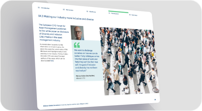 01 Introduction 02 Workplace 03 Workforce 04 Marketplace 05 Next steps 04.3 Making our industry more inclusive and diverse The European CFO Forum for Asset Management published its first white paper on disclosure of Diversity and Inclusion (D&I) Metrics in the asset management industry. As stakeholders’ appetite for D&I information continues to grow, the paper discusses the current state of D&I We want to challenge disclosure and highlights today’s best ourselves on how we can do practices in the industry. Markus Kobler, better. If any colleague comes AllianzGI CFO was one of the lead authors of the paper which can be into their place of work and downloaded here. feels they can’t be their true self, the goal of inclusion and diversity has not been reached yet.” Markus Kobler (He/His/Him) AllianzGI CFO Allianz Global Investors Diversity, Equity and Inclusion Report 2022 34