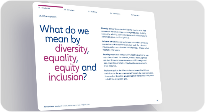 01 Introduction 02 Workplace 03 Workforce 04 Marketplace 05 Next steps 01.1 Our approach Diversity is the endless mix of visible and invisible traits that make each individual unique, such as gender, age, disability, What do we nationality, ethnicity, sexual orientation, cultural background, personality types, and family status. mean by Inclusion is the behaviour we demonstrate and the processes we use to enable everyone to give their best. Our culture of inclusion embraces and values our differences – it helps us feel diversity, free to be who we are. Equality means that everyone is treated the exact same way regardless of need. For example, it means that two groups equality, are given the exact same resources to fulfill a designated goal, regardless of whether they have the same access to equity and those resources. Equity recognises the different circumstances of individuals and allocates the resources needed to reach the exact same goal. inclusion? It means that those two groups are given the resources they need to fulfill the designated goal. Allianz Global Investors Diversity, Equity and Inclusion Report 2022 05