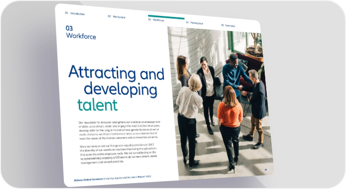 01 Introduction 02 Workplace 03 Workforce 04 Marketplace 05 Next steps 03 Workforce Attracting and developing talent Our reputation for inclusion strengthens our brand as an employer and enables us to attract, retain and engage the most talented employees, develop skills for the long term and achieve gender balance at senior levels. A diverse workforce furthermore helps us to understand and meet the needs of the diverse customers and communities we serve. Since we announced our first gender equality ambitions in 2017, the diversity of our workforce has been improving through actions that span the entire employee cycle. We are consolidating on this by systematically applying a DEI lens to all our recruitment, talent management and reward practices. Allianz Global Investors Diversity, Equity and Inclusion Report 2022 1616