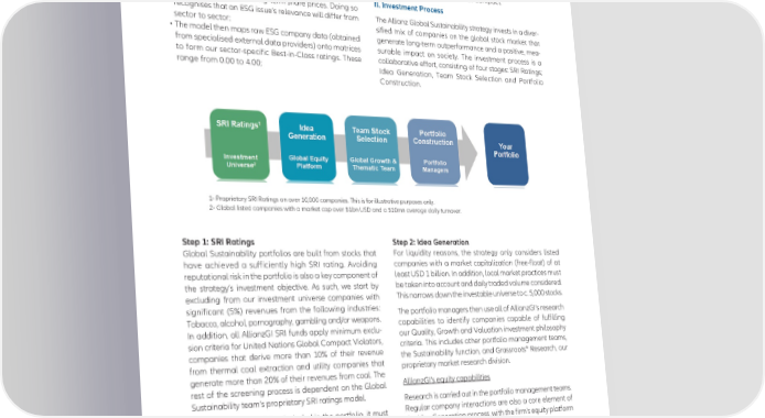 EuRoSIf EuRopEaN SRI TRaNSpaRENcy coDE - DEcEmbER 2021 In brief: • a minimum SRI rating threshold identifies the best-in- • allianzGI’s SRI investment strategies are built using our class universe. In addition, all allianzGI’s SRI strategies proprietary best-in-class SRI ratings model; implement a Human Rights filter. our analysis in this • This model covers over 10,000 issuers globally across area is based on the issuer’s respect of human rights in equities, corporate bonds, sovereigns, agency and supra- its business conduct, including integration of the uni- national bonds; versal Declaration of Human Rights principles, respect • our model starts by identifying over 200 ESG indicators of major International Labour organization conventions for each sector. These are then weighted according to and signature of the uN Global compact. how material our Sustainability team views each indi- II. Investment Process cator in the context of long-term share prices. Doing so recognises that an ESG issue’s relevance will differ from The allianz Global Sustainability strategy invests in a diver- sector to sector; sified mix of companies on the global stock market that • The model then maps raw ESG company data (obtained generate long-term outperformance and a positive, mea- from specialised external data providers) onto matrices surable impact on society. The investment process is a to form our sector-specific best-in-class ratings. These collaborative effort, consisting of four stages: SRI Ratings; range from 0.00 to 4.00; Idea Generation, Team Stock Selection and portfolio construction. 1- proprietary SRI Ratings on over 10,000 companies. This is for illustrative purposes only. 2- Global listed companies with a market cap over $1bn uSD and a $10mn average daily turnover. Step 1: SRI Ratings Step 2: Idea Generation Global Sustainability portfolios are built from stocks that for liquidity reasons, the strategy only considers listed have achieved a sufficiently high SRI rating. avoiding companies with a market capitalization (free-float) of at reputational risk in the portfolio is also a key component of least uSD 1 billion. In addition, local market practices must the strategy’s investment objective. as such, we start by be taken into account and daily traded volume considered. excluding from our investment universe companies with This narrows down the investable universe to c. 5,000 stocks. significant (5%) revenues from the following industries: The portfolio managers then use all of allianzGI’s research Tobacco, alcohol, pornography, gambling and/or weapons. capabilities to identify companies capable of fulfilling In addition, all allianzGI SRI funds apply minimum exclu- our Quality, Growth and Valuation investment philosophy sion criteria for united Nations Global compact Violators, criteria. This includes other portfolio management teams, companies that derive more than 10% of their revenue the Sustainability function, and Grassroots® Research, our from thermal coal extraction and utility companies that proprietary market research division. generate more than 20% of their revenues from coal. The rest of the screening process is dependent on the Global allianzGI’s equity capabilities Sustainability team’s proprietary SRI ratings model. Research is carried out in the portfolio management teams. In order for a stock to be included in the portfolio, it must Regular company interactions are also a core element of have an SRI Rating categorised as either ‘average’ or ‘best- the Idea Generation process, with the firm’s equity platform in-class’. No stocks rated ‘Worst-in-class’ can be included meeting over 1,000 businesses a year. within the portfolio. moreover, 75% of the portfolio must Every investment professional maintains and is accountable consist of stocks backed by a best-in-class SRI rating. The for a conviction list, which signals their views on stocks they fund has scope to invest up to 25% of the portfolio in stocks cover. There are three ratings for each stock – high, medium that demonstrate average, but improving ESG characteristics. and low – reflecting their stock preferences. Sorting stocks 14