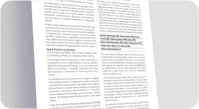 EuRoSIf EuRopEaN SRI TRaNSpaRENcy coDE - DEcEmbER 2021 This investment case details the extent to which a stock Typically, a high conviction stock will have an active posi- meets the team’s quality, growth and valuation criteria, as tion size of between 200-300 basis points. If a stock goes well as its ESG performance. The investment case is pre- beyond a 300 basis point active position, it will be trimmed sented and discussed, with further research or company in order to mitigate any downside risk. Stocks with an meetings potentially required before the discussion is active position of 100 basis points are typically lower conclusive. conviction investments. These will either be recent, new Stocks which are approved by the team are then free to be additions to the fund or alternatively, positions due to be included in all team portfolios, subject to any respective exited that are sources of cash for new ideas. guidelines. once a stock has been approved, the Stock Each stock that is added or removed from the portfolio Sponsor is responsible for maintaining research coverage. is considered for its marginal contribution to risk at the The Stock Sponsor can be any portfolio manager within aggregate portfolio level which further controls the risk the investment team. Having a Sponsor for each stock is an profile of the strategy. The portfolio managers do not excellent tool for keeping the discipline of the investment make any active sector, country or market capitalization process and ensuring that all stocks adhere to a shared allocation decisions. factor risk is monitored and minimi- philosophy. Likewise, regular discussion and anonymous zed so that stock-specific risk is the largest driver of returns. voting ensures a collegiate approach to intellectual The primary risk model used to gauge the effect of new debate. position on the factors driving the portfolio’s ex-ante tracking error is apT. Given that our SRI ratings are sector-relative, at each weekly meeting, the investment Growth team also we are not forced to be structurally underweight certain reviews the structure and performance of its existing port- sectors in order to maintain the ESG integrity of the portfolio. folios, focusing on approved stocks and possible additions or replacements. Discussion centres on the most recent Allianz Securicash SRI, Allianz Euro Oblig Court periods of performance, highlighting those stocks which Terme ISR, Allianz Epargne Monetaire ISR, have added value but also any negative contributors and Allianz Pee Monetaire ISR, Allianz Monetaire (2C), the reasons behind this. This provides the Global Growth Allianz Euro Short Term Bonds SRI, team with a means of measuring stock selection success. Step 4: Portfolio Construction Allianz Rentenfonds (*) Gunnar miller and Robbie miles construct allianz Global our stock-picking strategy is based on the dual focus of Sustainability portfolios at a separate weekly meeting. financial and “Social Responsibility” criteria. The nonfinancial The strategy invests primarily (up to 75% of portfolios) in analysis of securities, based on attention to environmental, companies that are considered best-in-class according to human, sustainable development issues, and societal rela- allianzGI’s proprietary SRI ratings. It can also invest up to tions, allows us to assess the value of a security differently, 25% of the portfolio in ‘average’ rated stocks that have by identifying risks and potential value destructions asso- demonstrated a commitment to improving ESG perfor- ciated with a given issuer, which cannot be revealed by mance. financial analysis alone. This flexibility incentivises the portfolio managers to engage The investment process starts with top down analysis to with investee company managements in order to press for anticipate money market trends and rate changes based continued ESG improvements. We believe that superior on regular studies of the macroeconomic environment, on ESG performance will ultimately translate into share price forecasts of central bank policies and the assessment of appreciation. as a result, this mechanism is an important risk appetite in the market. In the second step, the portfolio source of alpha for the strategy, as well as positive, societal is constructed integrating the active strategies derived from impact. The strategy cannot hold any worst-in-class rated the top-down analysis with portfolio constraints and the names. bottom-up selection supported by our credit and ESG as per the investment philosophy, position sizes are decided research teams. according to the portfolio manager’s level of conviction in The interaction between financial criteria and ESG criteria a stock’s future financial and ESG performance. This may is a permanent aspect in our bottom-up selection process. be further supported by recent Grassroots® Research which The overall SRI rating is calculated for each company within substantiates our longer-term investment case, or clear posi- the investment universe, and these ratings are then used tive momentum in terms of the company’s ESG performance. to populate a proprietary database. This SRI ratings data- 16