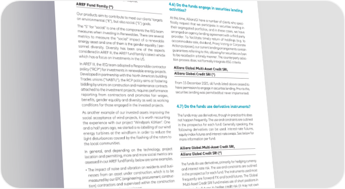 EuRoSIf EuRopEaN SRI TRaNSpaRENcy coDE - DEcEmbER 2021 allianz Epargne actions ISR Solidaire is a fund targeting • In the aREf fund family, where an Rcp policy is incorpo- financial performance by selecting companies whose social rated for aREf III, social issues such as fair wage and qualities are deemed to be of superior quality. our social treatment are covered. strategy aims both to protect the portfolio against social • Employee diversity: in future European transactions, there risks, but also to take advantage of the most advanced might be a specific focus on the employment of refugees companies in this area. The social criteria we take into with a willingness to be integrated into the European account concern different levels of the value chain, from society; progress against targets to be monitored. the company's relationship with its suppliers to the life of the product and its impact on society, including the mana- gement of the company's human capital. 4.6) Do the funds engage in securities lending AREF Fund Family (*) activities? at this time, allianzGI have a number of clients who speci- our products aim to contribute to meet our clients’ targets fically request that we participate in securities lending in on environmental (“E”), but also social (“S”) goals. their segregated portfolios, and in these cases, we have The “S” for “social” is one of the components the IEQ team arranged an agency lending agreement with a third party measures when investing in Renewables. There are several provider. To facilitate timely return of holdings (e.g. to metrics to measure the “social” impact of a renewable accommodate sale, dividend, proxy Voting or corporate energy asset and one of them is the gender equality / per- action purposes), our current lending arrangements contain sonnel diversity. Diversity has been one of the aspects guarantees referring to this, allowing for securities on loan considered in aREf III, the aREf fund family’s latest vehicle to be recalled in a timely manner. The counterparty selec- which has a focus on investments in the uS. tion process does not formally integrate ESG criteria. In aREf III, the IEQ team adopted a Responsible contractor Allianz Global Multi-Asset Credit SRI, policy (“Rcp”) for investments in renewable energy projects. Allianz Global Credit SRI (*) Developed in partnership with the North america’s building Trades unions (“NabTu”), the Rcp policy aims at fostering from 15 December 2021, all funds listed above ceased to bidding by unions on construction and maintenance contracts have permission to engage in securities lending. prior to this, attached to the investment projects, requires performance securities lending was permitted but never implemented. reporting from contractors and promotes fair wages, benefits, gender equality and diversity as well as working conditions for those engaged in the invested projects. 4.7) Do the funds use derivative instruments? as another example of our invested assets improving the The funds may use derivatives, though in practice this does social acceptance of wind projects, it is worth recounting not happen frequently. The use and constraints are outlined the experience with our project “Windpark Köhlen”. one in the prospectus for each fund. Generally speaking, the and a half years ago, we started a re-labelling of our wind following derivatives can be used: interest-rate futures, energy turbines at the windfarm in order to reduce the equity index futures and interest-rate swaps. See below for light disturbances caused by the flashing of the rotors to more information per fund. the local communities. In general, and depending on the technology, project Allianz Global Multi-Asset Credit SRI, location and permitting, more and more social metrics are Allianz Global Credit SRI (*) assessed in our aREf fund family. below are some examples. • The impact of noise and vibration on residents and busi- The funds do use derivatives, primarily for hedging currency nesses from an asset under construction, which is to be and interest rate risk. The use and constraints are outlined measured by our Epc (engineering, procurement, construc- in the prospectus for each fund. The instruments used most tion) contractors and supervised within the construction frequently are forward fX and bond futures. The Global supervision tasks of our engineers. multi-asset credit SRI fund makes use of short positions in • Health and safety metrics such as accident rates, disability equity index futures to hedge credit risk (it may not own access, security, labour standards in procurement policy long positions). The Global credit SRI fund has also used (or similar), affordable workforce housing, social enterprise Index credit Default Swaps (cDS) to manage credit risk partnering, community development (and as to be compi- exposure. led in the Epc and/or o&m (operation and maintenance agreements). 34