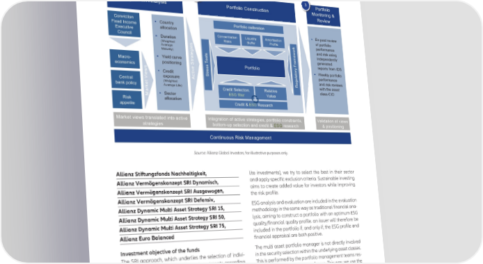EuRoSIf EuRopEaN SRI TRaNSpaRENcy coDE - DEcEmbER 2021 base reflects our critical evaluation of companies’ ESG • 10% of assets could have an SRI rating ≤ average or not positioning and helps in selecting stocks that may be rated; considered for inclusion in the portfolio. • Excluded issuers (violating the Human Rights criteria, and • at least 90% of portfolio assets must receive an internal issuers addressed by the allianzGI’s SRI exclusion policy) SRI rating ≥ sector average; are not allowed in the portfolio. O P Q 1+"&0+)%+' :+;<=+9,'>,?)@2%2 1+"&0+)%+'!+,2&"3*&%+, 4+,%&+"%,5'6' 7#8%#9 !+,8%*&%+,' ! !+3,&"@' 1+"&0+)%+'*?)%B"?&%+, J%F#$'A,*+C#' ?))+*?&%+, ! .F<;+2&'"#8%#9' .F#*3&%8#' !+,*#,&"?&%+,' N%R3%$%&@' >C+"&%2?&%+,' +0';+"&0+)%+' !+3,*%) ! =3"?&%+,' 7%2G2 S300#" 1"+0%)# G ;#"0+"C?,*#' KH#%5D&#$' 2 " >8#"?5#' # + ?,$'"%2G'32%,5' % 9 4?&3"%&@L 5 2 # %,$#;#,$#,&)@' # & C & 2 ? 5#,#"?&#$' ! M%#)$'*3"8#' ? # " " J 4?*"+< & : ' "#;+"&2'0"+C'A=( ;+2%&%+,%,5 ( ' @ #*+,+C%*2 ' 2 1+"&0+)%+ " # 2 + ! H##G)@';+"&0+)%+' 2 8 # & % " ? 9 ! !"#$%&' & & ) ;#"0+"C?,*#' # * ( 3 % #F;+23"#' > 5 ?,$'"%2G'"#8%#92' !#,&"?)' E # ' KH#%5D&#$' & 7 9%&D'&D#'?22#&' B?,G';+)%*@' # >8#"?5#'N%0#L G !"#$%&'(#)#*&%+,- 7#)?&%8#' " *)?22'!AI ? ! (#*&+"' .(/'0%)&#" E?)3#' 7%2G' 4 ?))+*?&%+, ?;;#&%&# !"#$%&'6'.(/ 7#2#?"*D 4?"G#&'8%#92'&"?,2)?&#$'%,&+'?*&%8#' A,"?&%+,'+0'?*&%8#'2&"?%#2-';+"&0+)%+'*+,2&"?%,&2-' E?)%$?&%+,'+0'8%#92' 2&"?%#2 B+&&+C<3;'2#)#*&%+,'?,$'*"#$%&'6'.(/ "#2#?"*D 6';+2%&%+,%,5 !+,&%,3+32'7%2G'4?,?5#C#,& Source: allianz Global Investors, for illustrative purposes only. Allianz Stiftungsfonds Nachhaltigkeit, lite investments), we try to select the best in their sector Allianz Vermögenskonzept SRI Dynamisch, and apply specific exclusion criteria. Sustainable investing Allianz Vermögenskonzept SRI Ausgewogen, aims to create added value for investors while improving the risk profile. Allianz Vermögenskonzept SRI Defensiv, ESG analysis and evaluation are included in the evaluation Allianz Dynamic Multi Asset Strategy SRI 15, methodology in the same way as traditional financial ana- Allianz Dynamic Multi Asset Strategy SRI 50, lysis, aiming to construct a portfolio with an optimum ESG Allianz Dynamic Multi Asset Strategy SRI 75, quality/financial quality profile. an issuer will therefore be Allianz Euro Balanced included in the portfolio if, and only if, the ESG profile and financial appraisal are both positive. Investment objective of the funds The multi asset portfolio manager is not directly involved The SRI approach, which underlies the selection of indivi- in the security selection within the underlying asset classes. dual securities, involves analysing investments according This is performed by the portfolio management teams res- to ESG criteria. When selecting the individual securities in ponsible for the specific asset classes. This way, we use the the core portfolio and within the scope of the global respective experts on all individual decision levels in the search for opportunities in interesting asset classes (satel- management of the fund. 17