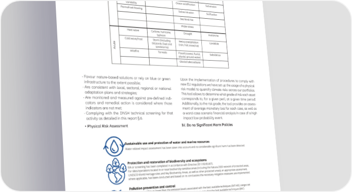 EuRoSIf EuRopEaN SRI TRaNSpaRENcy coDE - DEcEmbER 2021 Figure: Classification of climate-related hazards - favour nature-based solutions or rely on blue or green upon the implementation of procedures to comply with infrastructure to the extent possible; new Eu regulations we have set up the usage of a physical - are consistent with local, sectoral, regional or national risk model to quantify climate risks across our portfolios. adaptation plans and strategies; This tool allows to determine what grade of risk each asset - are monitored and measured against pre-defined indi- corresponds to, for a given peril, at a given time period. cators and remedial action is considered where those additionally, to the risk grade, the tool provides an assess- indicators are not met; ment of average monetary loss for each case, as well as - complying with the DNSH technical screening for that a worst-case scenario financial analysis in case of a high activity as detailed in this report §.6. impact low probability event. • Physical Risk Assessment IV. Do no Significant Harm Policies 31
