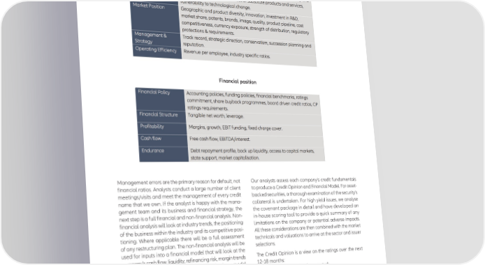 EuRoSIf EuRopEaN SRI TRaNSpaRENcy coDE - DEcEmbER 2021 The factors that we consider most important when analysing credit issuers are highlighted in the table below. our credit analysts distribute their research to the other members of the investment team on each individual issuer that we cover. Business position Financial position management errors are the primary reason for default, not our analysts assess each company’s credit fundamentals financial ratios. analysts conduct a large number of client to produce a credit opinion and financial model. for asset- meetings/visits and meet the management of every credit backed securities, a thorough examination of the security’s name that we own. If the analyst is happy with the mana- collateral is undertaken. for high yield issues, we analyse gement team and its business and financial strategy, the the covenant package in detail and have developed an next step is a full financial and non-financial analysis. Non- in-house scoring tool to provide a quick summary of any financial analysis will look at industry trends, the positioning limitations on the company or potential adverse impacts. of the business within the industry and its competitive posi- all these considerations are then combined with the market tioning. Where applicable there will be a full assessment technicals and valuations to arrive at the sector and issuer of any restructuring plan. The non-financial analysis will be selections. used for inputs into a financial model that will look at the company’s cash flow, liquidity, refinancing risk, margin trends The credit opinion is a view on the ratings over the next and capital structure. after this stage, if the business model 12-18 months: appears to make sense, the analyst will review any cove- • 5: multiple notch upgrade expected; nants and capital structure to help quantify downside risk. • 4: Single notch upgrade expected; The final stage is to assess the relative value of this com- • 3: No rating change expected; pany and its securities versus a peer group. This will lead to • 2: Single notch downgrade expected; a recommendation to the portfolio managers. • 1: multiple notch downgrade expected. 22