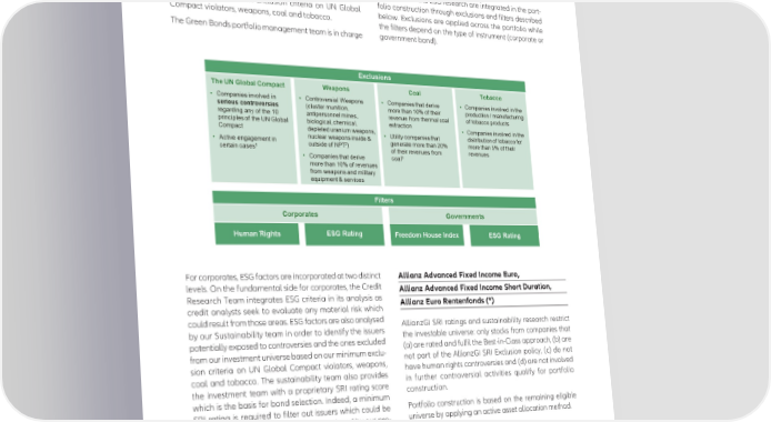 EuRoSIf EuRopEaN SRI TRaNSpaRENcy coDE - DEcEmbER 2021 Allianz Green Bond (*) of research on the “Green” aspects of the Green bond portfolios and notably the assessment of the compliance ESG factors are incorporated at two distinct levels. on the of the bonds with the Green bond principles, the analysis fundamental side, the credit Research Team integrates ESG of the projects financed and of the climate strategy of the criteria in its analysis as credit analysts seek to evaluate issuer. any material risk which could result from those areas. ESG Allianz Green Transition Bond (*) factors are also analysed by our Sustainability team in order to identify the issuers potentially exposed to contro- The results of the ESG research are integrated in the port- versies and the ones excluded from our investment universe folio construction through exclusions and filters described based on our minimum exclusion criteria on uN Global below. Exclusions are applied across the portfolio while compact violators, weapons, coal and tobacco. the filters depend on the type of instrument (corporate or The Green bonds portfolio management team is in charge government bond). for corporates, ESG factors are incorporated at two distinct Allianz Advanced Fixed Income Euro, levels. on the fundamental side for corporates, the credit Allianz Advanced Fixed Income Short Duration, Research Team integrates ESG criteria in its analysis as Allianz Euro Rentenfonds (*) credit analysts seek to evaluate any material risk which could result from those areas. ESG factors are also analysed allianzGI SRI ratings and sustainability research restrict by our Sustainability team in order to identify the issuers the investable universe: only stocks from companies that potentially exposed to controversies and the ones excluded (a) are rated and fulfil the best-in-class approach, (b) are from our investment universe based on our minimum exclu- not part of the allianzGI SRI Exclusion policy, (c) do not sion criteria on uN Global compact violators, weapons, have human rights controversies and (d) are not involved coal and tobacco. The sustainability team also provides in further controversial activities qualify for portfolio the investment team with a proprietary SRI rating score construction. which is the basis for bond selection. Indeed, a minimum SRI rating is required to filter out issuers which could be portfolio construction is based on the remaining eligible exposed to one of the four domains analyzed by our pro- universe by applying an active asset allocation method. prietary SRI model (ESG and business behaviour). Allianz Emerging Markets Equity SRI (*) for emerging market sovereign bonds, we apply a model designed to analyse the sustainable behaviour and per- The team seeks to exploit inefficiencies in emerging markets formance of governments in emerging markets, based on equities via the blending of a scientific investment process 20+ ESG factors. with a human overlay. The team employs a technology 24