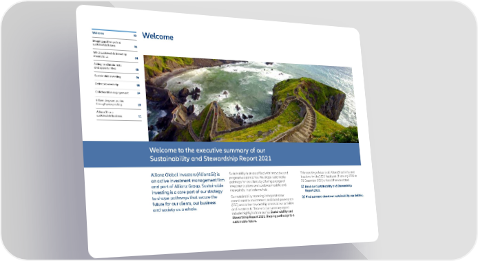 Welcome 02 Welcome Shaping pathways to a sustainable future 03 What sustainable investing means to us 04 Acting on climate risks and opportunities 05 Sustainable investing 06 Active stewardship 08 Collaborative engagement 09 Influencing companies through proxy voting 10 AllianzGI as a sustainable business 11 Welcome to the executive summary of our Sustainability and Stewardship Report 2021 Allianz Global Investors (AllianzGI) is Sustainability is an area filled with innovative and This reporting relates to all AllianzGI activities and an active investment management firm progressive approaches. We shape sustainable locations for the 2021 fiscal year (1 January 2021 to and part of Allianz Group. Sustainable pathways for our clients by offering a range of 31 December 2021) unless otherwise stated. investment options and guidance in public and, Read our Sustainability and Stewardship investing is a core part of our strategy increasingly, in private markets. Report 2021. to shape pathways that secure the Our sustainability reporting incorporates our Find out more about our sustainability capabilities. future for our clients, our business commitment to environment, social and governance and society as a whole. (ESG) and active stewardship across all our activities and investments. This executive summary report includes highlights from our full Sustainability and Stewardship Report 2021: Shaping pathways to a sustainable future.