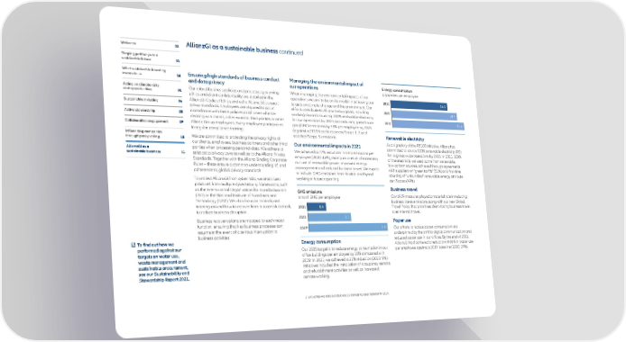 Welcome 02 AllianzGI as a sustainable business continued Shaping pathways to a sustainable future 03 What sustainable investing Ensuring high standards of business conduct Managing the environmental impact of means to us 04 Energy consumption and data privacy our operations gigajoules per employee Acting on climate risks Our robust business policies and processes governing When managing the environmental impacts of our and opportunities 05 ethics and client confidentiality are detailed in the operations we aim to be a role model in achieving our 2021 16.1 Sustainable investing 06 AllianzGI Code of Ethics and echo Allianz SE’s overall targets on climate change and the environment. Our group standards. Employees are required to act in efforts contribute to Allianz Group goals, including 2020 18.7 Active stewardship 08 accordance with these policies at all times whether working towards sourcing 100% renewable electricity dealing with clients, other external third parties or other for our operations by 2023 and reducing greenhouse 2019 20.6 Collaborative engagement 09 Allianz Group employees. Every employee participates gas (GHG) emissions by 38% per employee by 2025 in regular compliance training. (against a 2019 baseline) across Scope 1, 2 and Influencing companies We are committed to protecting the privacy rights of selected Scope 3 emissions. Renewable electricity through proxy voting 10 As a signatory of the RE100 initiative, Allianz has our clients, employees, business partners and other third Our environmental impacts in 2021 committed to source 100% renewable electricity (RE) AllianzGI as a parties when processing personal data. We adhere to We achieved a 77% reduction in GHG emissions per for its group-wide operations by 2023. In 2021, 100% sustainable business 11 strict data privacy laws as well as to the Allianz Privacy employee (2020: 46%), mainly as a result of increasing Standards. Together with the Allianz Binding Corporate of the electricity we used came from renewable, Rules – these ensure a common understanding of, and our use of renewable power, improved energy low-carbon sources, achieved through agreements adherence to, global privacy standards. management and reduced business travel. We expect with suppliers on “green tariffs” (51%) and first-time to include GHG emissions from flexible and hybrid sourcing of “unbundled” renewable energy attribute To protect AllianzGI from cyber risks, we select best working in future reporting. certificates (49%). practices from multiple cybersecurity frameworks, such Business travel as the International Organization for Standardization GHG emissions (ISO) or the National Institute of Standards and tons of GHG per employee Covid-19 measures played a material role in reducing Technology (NIST). We also focus on controls and business travel emissions along with our new Global training around how to recover from a successful attack, 2021 0.9 Travel Policy that prioritises client-facing business travel to reduce business disruption. over internal travel. Business recovery plans are mapped to each major 2020 2.1 Paper use function, ensuring that key business processes can 20191 3.9 Our efforts to reduce paper consumption are resume in the event of a serious interruption to underpinned by the shift to digital communication and business activities. reduced paper use in our offices. By the end of 2021, To find out how we Energy consumption AllianzGI had achieved a reduction of 66% in paper use performed against our Our 2025 target is to reduce energy consumption in our per employee against a 2019 baseline (2020: 29%). targets on water use, office buildings per employee by 10% compared with waste management and 2019. In 2021, we achieved a 22% reduction (2020: 9%). sustainable procurement, Initiatives included the installation of occupancy sensors see our Sustainability and and refurbishment activities as well as increased Stewardship Report 2021. remote working. 1 GHG emissions data (old absolute 3.5 tonnes) has been restated for 2019.