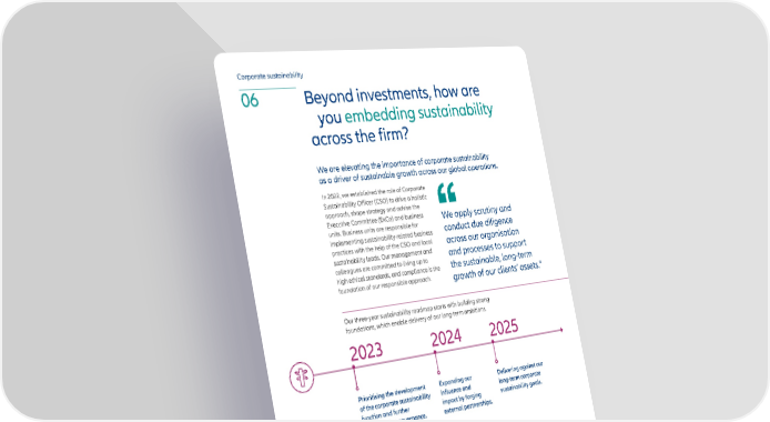 Corporate sustainability 06 Beyond investments, how are you embedding sustainability across the firm? We are elevating the importance of corporate sustainability as a driver of sustainable growth across our global operations. In 2022, we established the role of Corporate Sustainability Officer (CSO) to drive a holistic approach, shape strategy and advise the Executive Committee (ExCo) and business We apply scrutiny and units. Business units are responsible for conduct due diligence implementing sustainability-related business practices with the help of the CSO and local across our organisation sustainability leads. Our management and and processes to support colleagues are committed to living up to the sustainable, long-term high ethical standards, and compliance is the foundation of our responsible approach. growth of our clients’ assets.” Our three-year sustainability roadmap starts with building strong foundations, which enable delivery of our long-term ambitions. 2023 2024 2025 Prioritising the development Expanding our Delivering against our of the corporate sustainability influence and long-term corporate function and further impact by forging sustainability goals. strengthening governance. external partnerships.