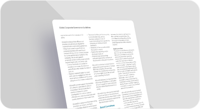Global Corporate Governance Guidelines against tenure limits in excess of 12 – The board fulfilling its fiduciary duty non-executive directors and report on years. to shareholders (eg, serious their activities to shareholders. Any business conduct or lack of committee should have the authority AllianzGI believes that officers and supervision allegations against the to engage independent advisers directors should only be eligible for company or individual board where appropriate at the company’s indemnification and liability protection members); expense. if they have acted in good faith on – Reliability of the accounts and/or company business and were found the auditor’s report; Audit committee innocent of any civil or criminal charges – Substantial reporting and/or The board should disclose and explain for duties performed on behalf of the disclosure issues; or the main role and responsibilities of company. We do not support – Material legal proceedings the Audit Committee, as well as the proposals where liability cover extends instituted against the company or process by which the committee beyond legal costs, and which can: the directors in the year in question. reviews and monitors the quality of – L imit or eliminate all liability for audit, the robustness of internal monetary damages, for directors AllianzGI would also include failure to controls and the independence of the and officers who violate the duty of adequately guard against or manage external auditor. “Long-form” auditor care; or ESG risks including, for example, and audit committee reports should – Expand indemnification to cover climate risks, biodiversity-related risks become a standard reporting format acts, such as negligence, that are or human rights issues into account for all audit committees and external more serious violations of fiduciary when assessing the board. auditor. These should discuss the obligations than mere carelessness. scope of the audit, materiality AllianzGI believes it is important that thresholds, major audit and AllianzGI cannot support the election discharge of liabilities or ratification accounting issues reviewed by the of a director convicted of crime or of acts is sought for each individual Committee and the external auditor misconduct. We evaluate the re- director rather than the board as a during the year and their respective election of directors under whole. conclusions, as well as any identified investigation for civil or criminal areas of improvements. offenses on a case-by-case basis and AllianzGI may vote against individual usually abstain on their re-election. board members or the entire board AllianzGI normally expects the Audit where the directors have failed to take Committee to comprise directors who AllianzGI is concerned that non-voting action on the proposals approved by are unquestionably independent and directors, or censors, can have the shareholder meeting. have the appropriate qualifications, considerable influence on the board experience, skills and capacity to while not being directly accountable Board Committees contribute effectively to the to shareholders. Censors should be committee’s work. In companies with appointed only in the event of AllianzGI encourages all boards to co-determination structures, AllianzGI exceptional and temporary establish at least three key board would like to see at least 50% (and circumstances and if their presence committees specialising in audit, ideally a higher proportion) of adds significant value in terms of director nomination and compensation independent directors on the Audit board composition and board issues. Such committees constitute a Committee as well as an independent functioning. critical component of a robust committee chairperson. corporate governance structure and AllianzGI will consider composition, contribute to the proper functioning of AllianzGI also expects the Audit attendance and performance of the the board of directors. Other Committee Chairperson and, board during the year under review committees, such as a separate risk preferably, another committee when voting on proposals to committee, technology committee, member to have audit, accounting discharge the board of liabilities or sustainability committee, etc. may also or appropriate financial expertise, ratify the board’s acts. Where be appropriate depending on the unless there are stricter local laws. individual directors are not standing circumstances of the business. While for re-election during the year under we would not necessarily expect AllianzGI expects all companies to review, and we have concerns over companies to establish a separate establish a robust policy regulating board governance practices, we may sustainability committee, we would like and restricting the pledging of use the board discharge/ratification to understand how the board has company’s shares by executives. We proposals to express our concerns. anchored responsibility for expect the Audit Committee to sustainability matters on the board, oversee any pledging of shares by AllianzGI will vote against individual either with individual board members executive directors to ensure this directors or the whole board where or with a committee. The key board activity does not present undue risks there are concerns about: committees should be comprised of for minority shareholders. 8
