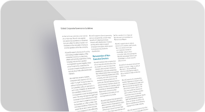 Global Corporate Governance Guidelines similar to those available under normal AllianzGI supports all-employee equity the Remuneration Committee and circumstances. We will vote against plans as we generally consider these fully disclosed to shareholders in a any severance payments or retirement beneficial in aligning employee Remuneration Report. bonuses when the amount paid is not interests with shareholders. However, disclosed or the recipient is moving to we may not be able to support AllianzGI supports annual votes on another position within the company. employee share plans, which appear executive remuneration, which provide to be excessively dilutive for the most consistent and clear AllianzGI expects disclosure of a policy shareholders. communication channel for addressing possible hedging of the shareholder concerns about company’s stock by its executives, Remuneration of Non- companies’ executive pay programs. where such activity is permitted. Using Executive Directors AllianzGI encourages moves to give hedging instruments to protect shareholders a vote on executive management against negative share AllianzGI believes that compensation remuneration. price movements undermines the of non-executive directors should be purpose of equity incentive plans and structured in a way that aligns their AllianzGI will vote against remuneration reduces alignment with shareholder interests with long-term interests of related proposals – either on policy or interests. shareholders, does not compromise the report – where insufficient their independence from management information has been provided to We note that, in some markets, or from controlling shareholders of the allow investors to make an informed companies seek approval of a so company, and does not encourage decision. called “budget” to pay its directors, excessive risk-taking behaviour. In without disclosing details of the particular, AllianzGI believes that non- AllianzGI expects all companies that remuneration policy or approach. In executive board members should not received high levels of dissent on their such cases, AllianzGI will review past receive variable remuneration, equity remuneration proposals to understand remuneration of directors and incentives or retirement benefits as the rationale behind negative votes management, as well as proposed pay these could compromise their and address investor concerns. We levels. We may not approve significant independence and ability to hold may vote against the Chairperson increases in board remuneration that management accountable. and members of the Remuneration are not linked to material changes in Committee where shareholder the business, or in the number, roles AllianzGI believes that non-executive concerns remain unaddressed despite and responsibilities of directors. We directors’ fees should be sufficient to significant shareholder dissent or would like to see all remuneration attract directors of appropriate calibre where we remain unsatisfied with related proposals to be sufficiently and experience, while all notable the remuneration policy following detailed to allow shareholders to differences in board members’ fees engagement with the company. assess the structure of and approach should reflect their responsibilities and to director remuneration. time commitment and be clearly AllianzGI expects all plans that allow explained and justified. grants of shares to executive directors Employee Remuneration to be put to a shareholder vote, We expect all non-executive directors regardless of whether the shares are Remuneration structures and to share their expertise and offer newly issued or purchased on the frameworks for employees should help advice to the board and management market. reinforce corporate culture and foster as part of their role. We therefore find performance. In this respect and in any chargeable consultancy services We also believe that all incentive accordance with applicable laws provided by directors inappropriate, as plans should be of a limited duration AllianzGI encourages companies to they compromise directors’ objectivity and require shareholder approval provide shareholders with information and ability to hold management prior to renewal. on the ratio between senior accountable. management compensation and that AllianzGI believes that the of the wider workforce, including AllianzGI cannot approve a substantial Remuneration Committee should have calculation methodology and changes increase in directors’ fees without a discretion to adjust pay levels under over time. robust justification by the company. the remuneration policy to reflect shareholder experience and help Performance measurement for staff Remuneration Committee avoid reputational and other risks to remuneration should incorporate risk and “Say on Pay” the business. However, we do not considerations to ensure that there are approve of unlimited discretion. no rewards for taking inappropriate The company’s remuneration policy risks at the expense of the company and the structure/quantum of pay for and its investors. each director should be determined by 18