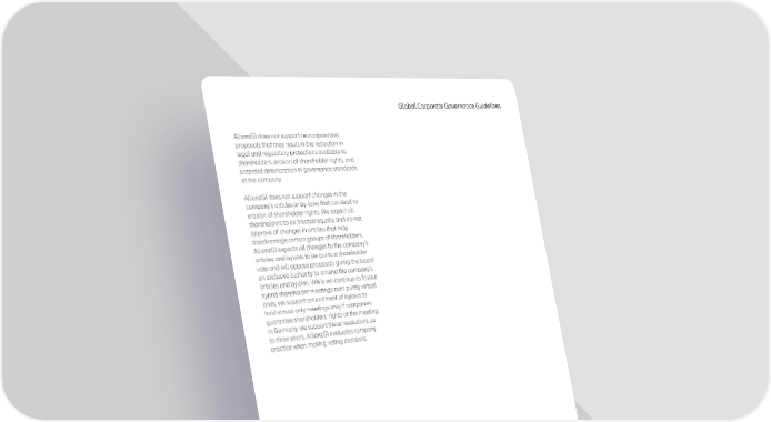 Global Corporate Governance Guidelines AllianzGI does not support reincorporation proposals that may result in the reduction in legal and regulatory protections available to shareholders, erosion of shareholder rights, and potential deterioration in governance standards at the company. AllianzGI does not support changes in the company’s articles or by-laws that can lead to erosion of shareholder rights. We expect all shareholders to be treated equally and do not approve of changes in articles that may disadvantage certain groups of shareholders. AllianzGI expects all changes to the company’s articles and bylaws to be put to a shareholder vote and will oppose proposals giving the board an exclusive authority to amend the company’s articles and bylaws. While we continue to favour hybrid shareholder meetings over purely virtual ones, we support amendment of bylaws to hold virtual only meetings only if companies guarantee shareholders’ rights at the meeting. In Germany, we support these resolutions up to three years. AllianzGI evaluates company practice when making voting decisions. 15