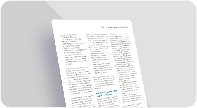 appointment of a combined Chairperson/CEO where: – The combination of the roles is temporary and covers a restructuring or a transition period of no longer than three years; or – The board meets AllianzGI’s independence criteria, has a Senior/ Lead Independent Director appointed to counterbalance the concentration of power at the top, and there are no major concerns over governance practices at the company. AllianzGI has a strong preference for an independent non-executive Chairperson of the board. However, we may support the election of a non- independent Chairperson if his/her election is well justified and deemed to be in the interests of the company and its investors, and provided the board has an appropriate balance of independence. AllianzGI expects a Senior/Lead Independent Director to be appointed in such circumstances. AllianzGI values the role of a Senior/ Lead Independent director and recommends that all companies create this role. A Senior/Lead Independent Director is important for investors as he/she is expected to be a strong independent voice on the board, able to advise and challenge the Chairperson. This is why any candidate for this role should be unquestionably independent. A Senior/Lead Independent Director should support the Chairperson, ensure appropriate checks and balances on the board where the Chairperson is not independent, implement an orderly succession plan for the Chairperson, and act as a point of contact for investors, non-executive directors and senior executives where normal channels of communication through the Chairperson are considered inappropriate. AllianzGI does not approve of a former CEO being appointed as Chairperson of the board as this can affect the balance of authority and responsibility between the board and management. Exceptionally, we may support such an appointment in some circumstances, including the following: – The arrangement is temporary to cover a specified restructuring or transition/ succession period of no longer than three years; – After a cooling-off period of ≥ five years and provided there is an appropriate balance of independence on the board; – The Chairperson to be is a founder and/or a major shareholder with a significant influence over the company; or – There is a convincing rationale provided by the company (eg, strong need for specific expertise and skills that are difficult to find outside the company). In all instances, we will be looking at the quality and independence of the board to ensure appropriate checks and balances are in place and the interests of minority shareholders are protected. Considerations when voting on director election AllianzGI cannot make an informed decision in the absence of sufficient information on nominees at the time of voting. Hence, we expect all companies to disclose: the names, core competencies and qualifications of the candidates, diversity characteristics and skills the candidates bring to the board, as well as professional and other background, recent and current board and management mandates at other public and private companies, factors affecting independence, and attendance at board and committee meetings. AllianzGI expects directors to attend all board and committee meetings held during the year. We expect disclosure of individual directors’ attendance in the annual report. The company must explain all instances of nonattendance. We will not consider “other professional or personal commitments” as an appropriate justification for a director’s non- attendance except in the first year following the appointment. AllianzGI expects executive and non- executive directors to have sufficient capacity and energy to discharge their board and committee responsibilities both under normal circumstances and when special situations or unexpected developments require substantial additional time commitment. Over- commitment by directors is a serious concern for investors as it can compromise the quality of boards and, where directors hold full-time executive positions, their executive responsibilities. While each director’s circumstances will be different, we will question all instances where: – A non-executive director has more than six non-executive roles in public or private companies 2 . We expect the total number of board mandates to be even smaller where directors have board committee responsibilities or other significant external commitments; – A non-executive Chairperson has more than one additional non- executive chairmanship, or more than three additional non-executive directorships in public or private companies; – A full-time executive director, including an Executive Chairperson, has more than one non-executive role in a private or public company. AllianzGI believes that in companies with a dual board structure, the Supervisory Board should comprise no more than one former executive to maintain a proper balance of authority and responsibility between executive and supervisory bodies and to encourage independence and fresh perspectives on the board. AllianzGI does not approve of age or tenure limits for directors, as our preference is for boards with a good balance of continuity and fresh perspectives. However, where limits have to be set, we prefer to see these expressed as a maximum number of terms that directors can serve rather than the age of individual board members. In companies and markets where board tenure is not seen as a factor affecting directors’ independence, we will normally vote Global Corporate Governance Guidelines 7