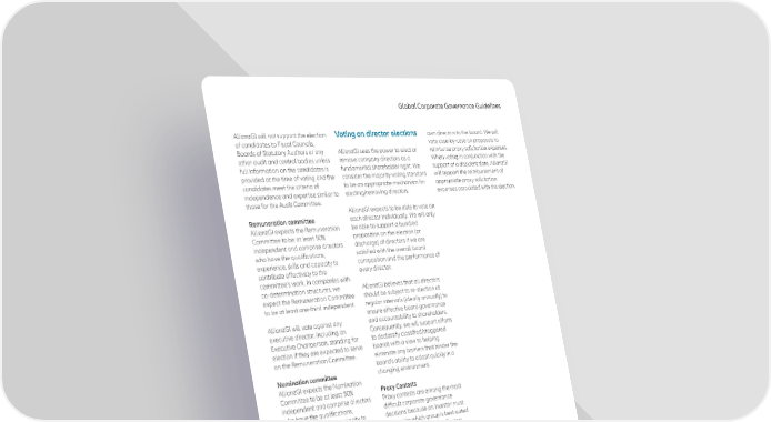AllianzGI will not support the election of candidates to Fiscal Councils, Boards of Statutory Auditors or any other audit and control bodies unless full information on the candidates is provided at the time of voting and the candidates meet the criteria of independence and expertise similar to those for the Audit Committee. Remuneration committee AllianzGI expects the Remuneration Committee to be at least 50% independent and comprise directors who have the qualifications, experience, skills and capacity to contribute effectively to the committee’s work. In companies with co-determination structures, we expect the Remuneration Committee to be at least one-third independent. AllianzGI will vote against any executive director, including an Executive Chairperson, standing for election if they are expected to serve on the Remuneration Committee. Nomination committee AllianzGI expects the Nomination Committee to be at least 50% independent and comprise directors who have the qualifications, experience, skills and capacity to contribute effectively to the committee’s work. In companies with co-determination structures, AllianzGI expects the Nomination Committee to be at least one-third independent. We expect the Nomination Committee to report to investors as regards the continuing appropriateness of the board composition and diversity, and steps taken to refresh the combination of experience, skills and diversity of perspectives on the board. Furthermore, we expect the Nomination Committee to have a succession plan in place for the key board and management positions, and would like to see a statement to this effect in the annual report and accounts. Voting on director elections AllianzGI sees the power to elect or remove company directors as a fundamental shareholder right. We consider the majority-voting standard to be an appropriate mechanism for electing/removing directors. AllianzGI expects to be able to vote on each director individually. We will only be able to support a bundled proposition on the election (or discharge) of directors if we are satisfied with the overall board composition and the performance of every director. AllianzGI believes that all directors should be subject to re-election at regular intervals (ideally annually) to ensure effective board governance and accountability to shareholders. Consequently, we will support efforts to declassify classified/staggered boards with a view to helping eliminate any barriers that hinder the board’s ability to adapt quickly in a changing environment. Proxy Contests Proxy contests are among the most difficult corporate governance decisions because an investor must determine which group is best suited to manage the company. Factors AllianzGI will consider in voting on proxy contests include the following: – Strategy of the incumbents versus the dissidents; – Past performance relative to peers; – Measures taken by the board to address issues raised by the dissidents and other investors; – Experience and skills of director candidates proposed by both sides; – Governance profile of the company; and – Evidence of management entrenchment. AllianzGI expects activist shareholders to engage in a robust constructive dialogue with the board of the target company before seeking to appoint own directors to the board. We will vote case-by-case on proposals to reimburse proxy solicitation expenses. When voting in conjunction with the support of a dissident slate, AllianzGI will support the reimbursement of appropriate proxy solicitation expenses associated with the election. 1) This guideline will not apply to Japan, Hong Kong and Singapore where we believe a longer transition period will be needed to achieve 30% gender diversity on boards. 2) Directorships in subsidiaries of a group are considered as part of a single board position. Global Corporate Governance Guidelines 9