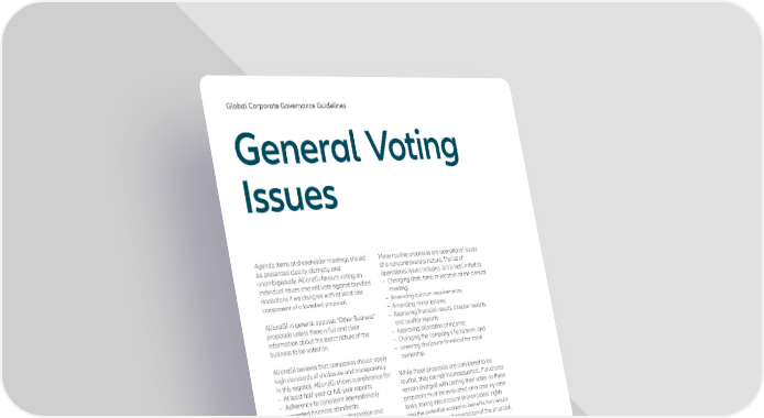 Agenda items at shareholder meetings should be presented clearly, distinctly and unambiguously. AllianzGI favours voting on individual issues and will vote against bundled resolutions if we disagree with at least one component of a bundled proposal. AllianzGI in general opposes “Other Business” proposals unless there is full and clear information about the exact nature of the business to be voted on. AllianzGI believes that companies should apply high standards of disclosure and transparency. In this regards, AllianzGI shows a preference for: – At least half-year or full-year reports; – Adherence to consistent internationally accepted financial standards; – Availability of financial information and investor communication in English; – Personal accessibility and availability of top management and non-executive directors to investors; – Publication of documents on the Internet; – Mandatory presence of directors at general meetings; – Adoption of electronic voting; and – Standardisation of voting forms and confirmation of votes to investors. AllianzGI will generally oppose proposals to provide management with the authority to adjourn an annual or special meeting absent compelling reasons to support the proposal. However, AllianzGI will support proposals that relate specifically to soliciting votes for a merger or transaction if supporting that merger or transaction. Many routine proposals are operational issues of a noncontroversial nature. The list of operational issues includes, but is not limited to: – Changing date, time, or location of the annual meeting; – Amending quorum requirements; – Amending minor bylaws; – Approving financial results, director reports, and auditor reports; – Approving allocation of income; – Changing the company’s fiscal term; and – Lowering disclosure threshold for stock ownership. While these proposals are considered to be routine, they are not inconsequential. Fiduciaries remain charged with casting their votes, so these proposals must be evaluated on a case-by-case basis, taking into account shareholders’ rights and the potential economic benefits that would be derived from implementation of the proposal. General Voting Issues Contact for queries Dr Antje Stobbe Tel: +49 (0) 69 24431 2630 Email: [email protected] AllianzGI Stewardship Team Email: [email protected] Global Corporate Governance Guidelines 22