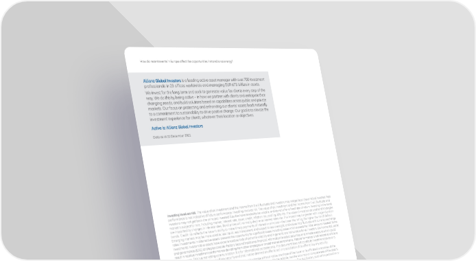 How do recent events in Europe affect the opportunities in transitional energy? Allianz Global Investors is a leading active asset manager with over 700 investment professionals in 23 offices worldwide and managing EUR 673 billion in assets. We invest for the long term and seek to generate value for clients every step of the way. We do this by being active – in how we partner with clients and anticipate their changing needs, and build solutions based on capabilities across public and private markets. Our focus on protecting and enhancing our clients’ assets leads naturally to a commitment to sustainability to drive positive change. Our goal is to elevate the investment experience for clients, whatever their location or objectives. Active is: Allianz Global Investors Data as at 31 December 2021 Investing involves risk. The value of an investment and the income from it will fluctuate and investors may not get back the principal invested. Past performance is not indicative of future performance. Investing involves risk. The value of an investment and the income from it will fluctuate and investors may not get back the principal invested. Equities have tended to be volatile, and do not offer a fixed rate of return. Investing in the bond market is subject to risks, including market, interest rate, issuer, credit, inflation risk, and liquidity risk. The value of most bonds and bond strategies are impacted by changes in interest rates. Bond prices will normally decline as interest rates rise. The impact may be greater with longer-duration bonds. Credit risk reflects the issuer’s ability to make timely payments of interest or principal—the lower the rating, the higher the risk of default. Emerging markets may be more volatile, less liquid, less transparent, and subject to less oversight, and values may fluctuate with currency exchange rates. Investments in alternative assets presents the opportunity for significant losses including losses which exceed the initial amount invested. Some investments in alternative assets have experienced periods of extreme volatility and in general, are not suitable for all investors. Environmental, social and governance (ESG) strategies consider factors beyond traditional financial information to select securities or eliminate exposure which could result in relative investment performance deviating from other strategies or broad market benchmarks. Past performance is not indicative of future performance. This is a marketing communication. It is for informational purposes only. This document does not constitute investment advice or a recommendation to buy, sell or hold any security and shall not be deemed an offer to sell or a solicitation of an offer to buy any security. The views and opinions expressed herein, which are subject to change without notice, are those of the issuer or its affiliated companies at the time of publication. Certain data used are derived from various sources believed to be reliable, but the accuracy or completeness of the data is not guaranteed and no liability is assumed for any direct or consequential losses arising from their use. The duplication, publication, extraction or transmission of the contents, irrespective of the form, is not permitted. This material has not been reviewed by any regulatory authorities. In mainland China, it is for Qualified Domestic Institutional Investors scheme pursuant to applicable rules and regulations and is for information purpose only. This document does not constitute a public offer by virtue of Act Number 26.831 of the Argentine Republic and General Resolution No. 622/2013 of the NSC. This communication’s sole purpose is to inform and does not under any circumstance constitute promotion or publicity of Allianz Global Investors products and/or services in Colombia or to Colombian residents pursuant to part 4 of Decree 2555 of 2010. This communication does not in any way aim to directly or indirectly initiate the purchase of a product or the provision of a service offered by Allianz Global Investors. Via reception of his document, each resident in Colombia acknowledges and accepts to have contacted Allianz Global Investors via their own initiative and that the communication under no circumstances does not arise from any promotional or marketing activities carried out by Allianz Global Investors. Colombian residents accept that accessing any type of social network page of Allianz Global Investors is done under their own responsibility and initiative and are aware that they may access specific information on the products and services of Allianz Global Investors. This communication is strictly private and confidential and may not be reproduced. This communication does not constitute a public offer of securities in Colombia pursuant to the public offer regulation set forth in Decree 2555 of 2010. This communication and the information provided herein should not be considered a solicitation or an offer by Allianz Global Investors or its affiliates to provide any financial products in Brazil, Panama, Peru, and Uruguay. In Australia, this material is presented by Allianz Global Investors Asia Pacific Limited (“AllianzGI AP”) and is intended for the use of investment consultants and other institutional/professional investors only, and is not directed to the public or individual retail investors. AllianzGI AP is not licensed to provide financial services to retail clients in Australia. AllianzGI AP is exempt from the requirement to hold an Australian Foreign Financial Service License under the Corporations Act 2001 (Cth) pursuant to ASIC Class Order (CO 03/1103) with respect to the provision of financial services to wholesale clients only. AllianzGI AP is licensed and regulated by Hong Kong Securities and Futures Commission under Hong Kong laws, which differ from Australian laws. This document is being distributed by the following Allianz Global Investors companies: Allianz Global Investors U.S. L