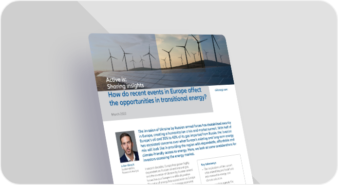 Active is: Sharing insights How do recent events in Europe affect allianzgi.com the opportunities in transitional energy? March 2022 The invasion of Ukraine by Russian armed forces has destabilised security in Europe, creating a humanitarian crisis and market turmoil. With half of Europe’s oil and 30% to 40% of its gas imported from Russia, the invasion has escalated concerns over what Europe’s existing and long-term energy mix will look like in providing the region with dependable, affordable and climate-friendly access to energy. Here, we look at some considerations for Julien Girault investors assessing the energy market. Sustainability Research Analyst In recent decades, Europe has grown highly dependent on Russian oil and natural gas, Key takeaways and the invasion of Ukraine by Russian armed – The implications of the current forces has put Europe in a difficult position. crisis extend beyond fossil fuels The price of energy has soared even as Europe into renewable energy and feels growing pressure to increase economic climate solutions sanctions against Russia. This has reignited a discussion about Europe’s energy mix, the – Europe needs to remedy the impact of rising costs and how to make a faster significant underinvestment in transition to clean energy. energy infrastructure to counter – The energy mix: Europe has been grappling a risk of sustained energy poverty with a sustained, widening gap between – The decline in fossil fuel use is its investment in energy infrastructure and likely to be slower, so opportunities its dependence on energy – a trend that is exist in carbon capture and energy replicated globally (see Exhibits 1 and 2). storage solutions, energy efficiency Since 1990, Europe’s total energy supply has technologies and local sourcing of contracted overall. And while its dependence strategic metals and minerals on coal, oil and natural gas has fallen from 84% to 71% since 1990, its use of gas has risen from 20% to 26%. it is now cheaper for many power stations – The impact of rising costs: Given the to burn coal than gas. And costs aside, to disruptions to the supply chain caused by maintain current energy levels while burning events in Ukraine, the impact on energy pricing less Russian gas, it may be necessary to burn is already very evident. At current price levels, more coal – hardly a sustainable proposition. Value. Shared.