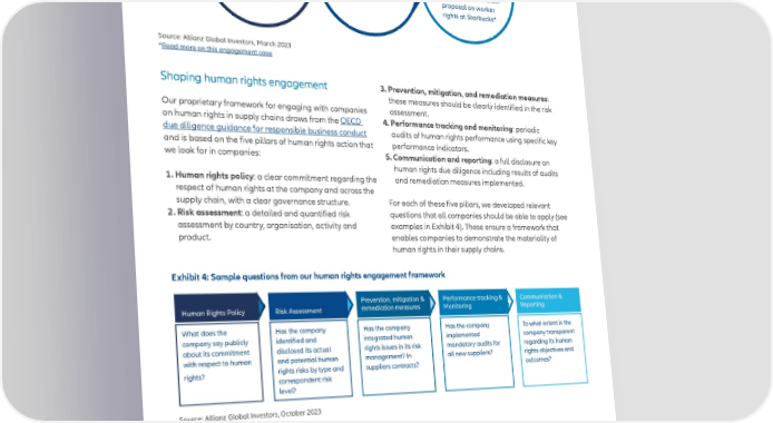HUMAN RIGHTS – THE WEAKEST LINK IN SUPPLY CHAINS? Exhibit 3: Escalating human rights issues at Starbucks August 2022 February 2023 March 2023 The Sustainability AllianzGI’s request to AllianzGI announced Research team highlights engage with Starbucks publicly that it intends to serious issues regarding did not resolve these issues. support the shareholder Starbucks’ union rights proposal on worker in the US. rights at Starbucks* Source: Allianz Global Investors, March 2023 *Read more on this engagement case Shaping human rights engagement 3. Prevention, mitigation, and remediation measures: these measures should be clearly identi昀椀ed in the risk Our proprietary framework for engaging with companies assessment. on human rights in supply chains draws from the OECD 4. Performance tracking and monitoring: periodic due diligence guidance for responsible business conduct audits of human rights performance using speci昀椀c key and is based on the 昀椀ve pillars of human rights action that performance indicators. we look for in companies: 5. Communication and reporting: a full disclosure on human rights due diligence including results of audits 1. Human rights policy: a clear commitment regarding the and remediation measures implemented. respect of human rights at the company and across the supply chain, with a clear governance structure. For each of these 昀椀ve pillars, we developed relevant 2. Risk assessment: a detailed and quanti昀椀ed risk questions that all companies should be able to apply (see assessment by country, organisation, activity and examples in Exhibit 4). These ensure a framework that product. enables companies to demonstrate the materiality of human rights in their supply chains. Exhibit 4: Sample questions from our human rights engagement framework Prevention, mitigation & Performance tracking & Communication & remediation measures Monitoring Reporting Human Rights Policy Risk Assessment What does the Has the company Has the company Has the company To what extent is the company say publicly identi昀椀ed and integrated human implemented company transparent about its commitment disclosed its actual rights issues in its risk mandatory audits for regarding its human with respect to human and potential human management? In all new suppliers? rights objectives and rights? rights risks by type and suppliers contracts? outcomes? correspondent risk level? Source: Allianz Global Investors, October 2023 Our engagement is focused on sectors that have a high metrics (eg, severity of human rights incidents, number of impact on the rights of workers, and is guided by the supply chain incidents and controversy 昀氀ags) to identify European Directive on Corporate Sustainability Due which of our investments are 昀氀agged for most extreme Diligence (see Exhibit 5). Using this sector analysis, we map controversies. our holdings across all asset classes to a combination of 4