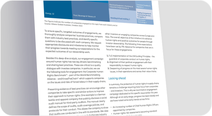 HUMAN RIGHTS – THE WEAKEST LINK IN SUPPLY CHAINS? Exhibit 5: Sector segmentation of targeted high-impact companies for our engagement campaign on human rights in supply chains Construction Materials & Building Product & Aerospace & Defense, 4 Homebuilding, 4 Metals & Mining, 10 Consumer Durables & Apparel, 2 Electrical Equipment, Machinery & Industrial Conglomerates, 4 Trading Companies & Commercial Services & Supplies, 2 Energy, 12 Retailing & Food retailing, 3 Information Food, Beverage & Tobacco, 8 Technology, 1 The 昀椀gures indicate the number of companies engaged on this topic from each industry sector Source: Allianz Global Investors, October 2023 To ensure speci昀椀c, targeted outcomes of engagements, we other investors on engaging companies across Europe and thoroughly analyse companies’ business practices, compare Asia. The overall objective of the initiative is to advance them with industry best practices, and identify speci昀椀c human rights and positive outcomes for people through questions to be discussed with each company. We request investor stewardship. The following three expectations appropriate disclosures and milestones to help monitor have been set by PRI Advance for companies that are in their progress towards meeting our expectations for the focus for these engagements: expected outcomes of our stewardship work. 1. Full implementation of the UN Guiding Principles – the Besides this deep-dive analysis, our engagement campaign guardrail of corporate conduct on human rights. around human rights has two key drivers: benchmarking 2. Alignment of their political engagement with their and sharing best practices. These are critical to a quality responsibility to respect human rights. dialogue with investee companies. In particular, we use 3.Deepening of progress on the most severe human rights the following tools for engagement: the Corporate Human issues, in their operations and across their value chains. 10 Rights Benchmark – part of the World Benchmarking 11 Alliance – and KnowTheChain which supports companies Looking ahead on the issues and risks of forced labour in their supply chains. In summary, the protection of human rights in supply chains Presenting evidence of best practices can encourage other remains a challenge requiring more focus from corporates companies to take speci昀椀c and similar actions to improve –and investors. This is why we launched an engagement their approach to human rights. One example is a German campaign dedicated to this speci昀椀c issue earlier this year. textile and apparel company that publicly discloses a social Although at an early stage, progress has been steady and audit manual for third-party auditors. The manual clearly we have noted some early trends across 昀椀rms: de昀椀nes the scope of audits, audit coverage policies, and protocols for their conduct. This allows the company to show • An increasing number of Chief Human Rights O昀케cers that audits are conducted in line with its standards. We view appointed by companies. this disclosure as advanced because it challenges industry • Human rights risk assessments becoming standard standards, and we recommend that other companies adopt practice, even if disclosures vary. this practice. • An advanced level of supply chain disclosures by European companies compared to other locations. Together we go further We will share further insights on both this engagement The 昀椀nal element of our approach is collaborative campaign, when it is concluded, and to what extent our engagement. To reinforce our engagement approach engagement framework will continue to evolve. 12 on human rights, in 2022, we joined the PRI Advance stewardship initiative for investors to act on human rights Read more about Allianz Group’s commitment to human and social issues. During this year, we worked jointly with rights: Respecting human rights. 5