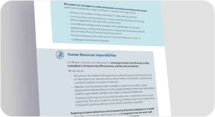 Leaders’ responsibilities We expect our managers to create and sustain an inclusive working environment where every individual’s unique contribution is valued and recognised by: – Acting as role models and demonstrating it in daily working activities; − Communicating and promoting our inclusion and diversity approach through active engagement, both internally and externally; − Committing to change where necessary and holding others to account; − Addressing any conduct that breaches our Global Anti-Harassment and Anti- Discrimination Policy of which they become aware; − Provide employees with a safe space to voice their ideas and concerns; − Creating an environment of equality. Human Resources responsibilities All HR team members are responsible for ensuring inclusion and diversity is fully embedded in all day-to-day HR processes, policies and procedures. HR will ensure: – Recruitment: fair treatment through the recruitment process, including checking job descriptions are relevant and non-discriminatory and that fair, objective and consistent questions are asked at interview. – Retention, training and promotion: oversight in respect of promotions, career development and training focus on skills, needs and talents rather than assumptions based on age, disability, gender, race, religion or sexual orientation etc. – Ongoing monitoring: all policies and procedures are monitored to ensure equal opportunity. This also includes the monitoring of data to gain an accurate picture of AllianzGI’s global workforce and to identify potential inequalities. Fostering inclusive behaviours and empowering talented colleagues to succeed as they are, is not only the right thing to do, but is integral to how we work, add value for our clients, enhance our brand and grow our business. 10