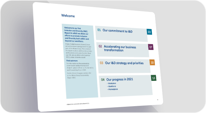 Welcome Welcome to our first 01 Our commitment to I&D 03 Inclusion and Diversity (I&D) Report in which we share our efforts to promote Inclusion and Diversity both within and beyond our workforce. Allianz Global Investors (AllianzGI) is an 02 A ccelerating our business 07 active investment management firm and part of the Allianz Group. The content of transformation this report relates to all AllianzGI activities and locations and covers the 2021 fiscal year (01 January 2021 to 31 December 2021), unless otherwise stated. Find out more 03 Our I&D str ategy and priorities 10 For information on the sustainability commitments and performance of AllianzGI, please refer to our Sustainability and Stewardship Report 2021. For the Allianz Group as a whole, refer to the Allianz Group Sustainability Report 2021. 04 Our pr ogress in 2021 13 – Workplace – Workforce – Marketplace AllianzGI Inclusion and Diversity Report 2021 01