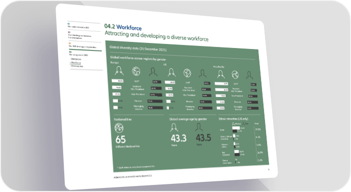 01 04.2 Workforce Our commitment to I&D Attracting and developing a diverse workforce 02 Accelerating our business transformation 03 Global diversity data (31 December 2021) Our I&D strategy and priorities 04 Our progress in 2021 Global workforce across regions by gender – Workplace Europe US Asia Pacific – Workforce – Marketplace 56.3% Staff* 43.7% 60.3% Staff* 39.7% 69.7% Staff* 30.3% 44.6% Assistant 55.4% 41.4% Assistant 58.6% 66.2% Assistant 33.8% Vice President Vice President Vice President 37.3% Vice President 62.7% 43.2% Vice President 56.8% 50.4% Vice President 49.6% 22.8% Director 77.2% 24.8% Director 75.2% 41.6% Director 58.4% 22.0% Managing 78.0% 11.5% Managing 88.5% 38.5% Managing 61.5% Director Director Director Nationalities Global average age by gender Ethnic minorities (US only) men €en tal Asian 26.6% 19.5% 15.2% Black / African 7.8% 4.1% 65 43.3 43.5 American 1.9% Different Nationalities Years Years Hispanic 5.5% 5.0% Latin 4.8% t 15.6% 16.9% nicate 17.6% r 0% 1.2% * Staff refers to entry-level corporate title mre races 1.9% ite 44.5% 53.3% AllianzGI Inclusion and Diversity Report 2021 58.6% 31