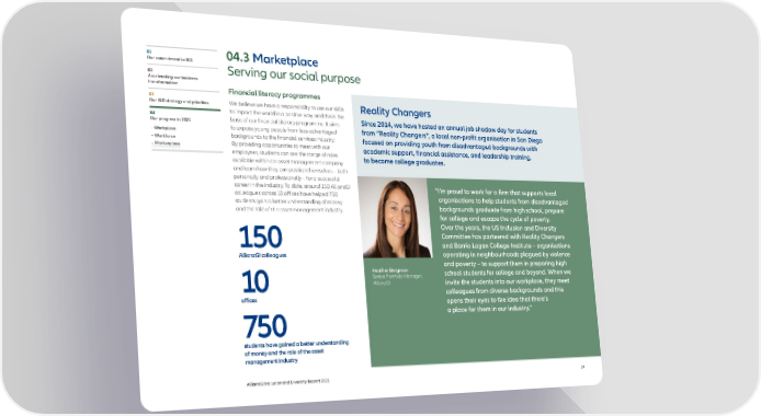 01 04.3 Marketplace Our commitment to I&D Serving our social purpose 02 Accelerating our business transformation Financial literacy programmes 03 Our I&D strategy and priorities We believe we have a responsibility to use our skills Reality Changers to impact the world in a positive way, and this is the 04 basis of our financial literacy programme. It aims Since 2014, we have hosted an annual job shadow day for students Our progress in 2021 from “Reality Changers”, a local non-profit organisation in San Diego – Workplace to expose young people from less-advantaged – Workforce backgrounds to the financial services industry. focused on providing youth from disadvantaged backgrounds with – Marketplace By providing opportunities to meet with our academic support, financial assistance, and leadership training, employees, students can see the range of roles to become college graduates. available within an asset management company and learn how they can position themselves – both personally and professionally – for a successful career in the industry. To date, around 150 AllianzGI “I’m proud to work for a firm that supports local colleagues across 10 offices have helped 750 organisations to help students from disadvantaged students gain a better understanding of money backgrounds graduate from high school, prepare and the role of the asset management industry. for college and escape the cycle of poverty. Over the years, the US Inclusion and Diversity 150 Committee has partnered with Reality Changers and Barrio Logan College Institute – organisations AllianzGI colleagues operating in neighbourhoods plagued by violence and poverty – to support them in preparing high Heather Bergman school students for college and beyond. When we Senior Portfolio Manager, 10 AllianzGI invite the students into our workplace, they meet offices colleagues from diverse backgrounds and this opens their eyes to the idea that there’s 750 a place for them in our industry.” students have gained a better understanding of money and the role of the asset management industry AllianzGI Inclusion and Diversity Report 2021 39