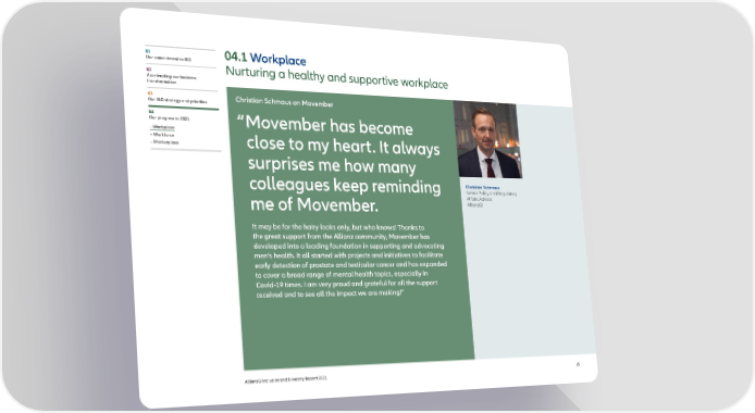 01 04.1 Workplace Our commitment to I&D Nurturing a healthy and supportive workplace 02 Accelerating our business transformation 03 Christian Schmaus on Movember Our I&D strategy and priorities 04 Our progress in 2021 “ Movember has become – Workplace – Workforce – Marketplace close to my heart. It always surprises me how many colleagues keep reminding Christian Schmaus Senior Policy and Regulatory Affairs Advisor, me of Movember. AllianzGI It may b e for the hairy looks only, but who knows! Thanks to the great support from the Allianz community, Movember has developed into a leading foundation in supporting and advocating men’s health. It all started with projects and initiatives to facilitate early detection of prostate and testicular cancer and has expanded to cover a broad range of mental health topics, especially in Covid-19 times. I am very proud and grateful for all the support received and to see all the impact we are making!” AllianzGI Inclusion and Diversity Report 2021 25