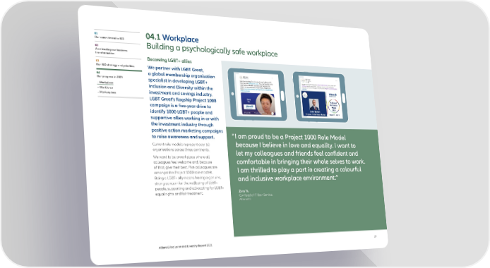 01 04.1 Workplace Our commitment to I&D Building a psychologically safe workplace 02 Accelerating our business transformation Becoming LGBT+ allies 03 Our I&D strategy and priorities We partner with LGBT Great, 04 a global membership organisation Our progress in 2021 specialist in developing LGBT+ – Workplace Inclusion and Diversity within the – Workforce investment and savings industry. – Marketplace LGBT Great’s flagship Project 1000 campaign is a five-year drive to identify 1000 LGBT+ people and supportive allies working in or with the investment industry through positive action marketing campaigns “I am proud to be a Project 1000 Role Model to raise awareness and support. Current role models represent over 60 because I believe in love and equality. I want to organisations across three continents. let my colleagues and friends feel confident and We want to be a workplace where all colleagues feel welcome and, because comfortable in bringing their whole selves to work. of that, give their best. Five colleagues are I am thrilled to play a part in creating a colourful amongst the Project 1000 role models. Being a LGBT+ ally means having a genuine, and inclusive workplace environment.” strong concern for the wellbeing of LGBT+ people, supporting and advocating for LGBT+ equal rights and fair treatment. Zero Yu Co-Head of IT User Service, AllianzGI AllianzGI Inclusion and Diversity Report 2021 19