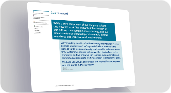 01 01.1 Foreword Our commitment to I&D 02 Accelerating our business transformation 03 Our I&D strategy and priorities I&D is a core component of our company culture 04 and how we work. We know that the strength of Our progress in 2021 – Workplace our culture, the execution of our strategy, and our – Workforce – Marketplace relevance to our clients depend on a truly diverse workforce and inclusive work environment. We’re working hard to prioritize diversity and inclusion in every decision we make and we’re proud of all the work we have done so far to increase diversity, equity and inclusion across our firm. Sustainable change will require the efforts of our entire workforce, and we know we can count on our passionate and committed colleagues to work relentlessly to achieve our goals. We hope you will be encouraged and inspired by our progress and the stories in this I&D report! AllianzGI Executive Committee AllianzGI Inclusion and Diversity Report 2021 02