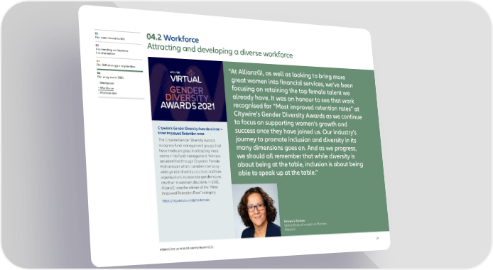 01 04.2 Workforce Our commitment to I&D Attracting and developing a diverse workforce 02 Accelerating our business transformation 03 Our I&D strategy and priorities “ At AllianzGI, as well as looking to bring more 04 great women into financial services, we’ve been Our progress in 2021 – Workplace focusing on retaining the top female talent we – Workforce – Marketplace already have. It was an honour to see that work recognised for “Most improved retention rates” at Citywire’s Gender Diversity Awards as we continue to focus on supporting women’s growth and Citywire’s Gender Diversity Awards winner – success once they have joined us. Our industry’s Most Improved Retention rates journey to promote inclusion and diversity in its The Citywire Gender Diversity Awards recognise fund management groups that many dimensions goes on. And as we progress, have made progress in attracting more women into fund management. Winners we should all remember that while diversity is are identified through Citywire’s Female about being at the table, inclusion is about being Alpha report which considers company- wide gender diversity practices and how able to speak up at the table.” organisations incorporate gender issues into their investment decisions. In 2021, AllianzGI was the winner of the “Most Improved Retention Rate” category. https://citywire.co.uk/alpha-female Deborah Zurkow Global Head of Investment Platform, AllianzGI AllianzGI Inclusion and Diversity Report 2021 33