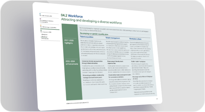 01 04.2 Workforce Our commitment to I&D Attracting and developing a diverse workforce 02 Accelerating our business transformation 03 We have enhanced our approach since 2017, with more actions from 2021–2022 spanning all levels of seniority and targeted Our I&D strategy and priorities focus on key functions and locations. 04 Revamping our gender equality plan Our progress in 2021 – Workplace Talent acquisition Talent management Workplace culture – Workforce – Marketplace 2017–2020 We include our Diversity Charter as an We offer equal access to a variety of learning We promote global flexible working and highlights addendum to contracts with recruitment and development programmes to support are a signatory of the Women In Finance partners to state our expectation of gender- our employees in their career development, Charter, a commitment to build a more diverse slates of candidates. We also require including a global mentoring platform. balanced and fair industry. We also actively gender-balanced short lists and diverse pools We also ensure equal reward through regular collaborate with peers through initiatives of interviewers and systematically review our discussions on individual pay with managers, such as the Investment Association, job posting language with Textio to ensure it along with reference to market benchmarks 100 Women in Finance and the She Can is inclusive. and functional and regional reviews, Be initiative to make our industry more to ensure fair pay decisions. attractive for women. 2021–2024 Increasing female representation Ensure equal development Build a “safer” workplace enhancements through talent attraction opportunities By enhancing psychological safety, Investing in focused communication with Create gender-balanced succession plans promoting our new Global Anti-Harassment target groups, sourcing diverse job boards, that include at least one female for all and Anti-Discrimination Policy and partnering with diversity-focused associations executive positions and consider at least one launching Anti-Harassment and Anti- and talent mapping to identify talent. female candidate for all hires/replacements. Discrimination training for all managers Enhancing candidate relationship Create tailor-made development plans and employees. management and talent pools for succession candidates Be recognised as Women’s Employer Reaching out to female candidates in Aim for gender-balanced presence in group of choice our industry to inform them of AllianzGI, executive development programmes and Show AllianzGI as an attractive employer our function and team for talent pipelining. functional development programmes as for female candidates by applying for well as AllianzGI programmes. Perform exit specific awards in countries where we have interviews with female leavers to identify good female representation (e.g. Taiwan, gender-related barriers in culture Hong Kong and France). and processes. Share pictures and quotes from current employees on LinkedIn to showcase diversity. AllianzGI Inclusion and Diversity Report 2021 28