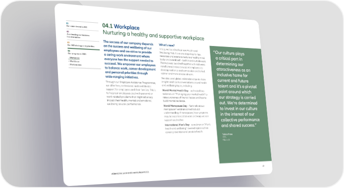 01 04.1 Workplace Our commitment to I&D Nurturing a healthy and supportive workplace 02 Accelerating our business transformation The success of our company depends What’s new? 03 on the success and wellbeing of our In July, we launched our new Health and Our I&D strategy and priorities “Our culture plays employees and we strive to provide Wellbeing Hub. It is a one-stop shop for tips, 04 a caring work environment where resources and events to nurture a healthy mind, a critical part in Our progress in 2021 body and overall self – both in and outside work. – Workplace everyone has the support needed to The Hub was launched together with mid-week determining our – Workforce succeed. We empower our employees mindfulness breaks to support employees to attractiveness as an – Marketplace to balance work, career development develop resilience and compassion and to feel and personal priorities through calmer and more at ease at work. inclusive home for wide-ranging initiatives. We also used global celebration days to share current and future Through our Employee Assistance Programmes, insights and spark conversations around health we offer free, professional and confidential and wellbeing topics, including: talent and it’s a pivotal support for employees and their families. This is World Mental Health Day – we hosted two point around which to help our employees deal with personal or webinars on “Managing your mental health” to our strategy is carried work-related problems that might adversely raise awareness of the risk factors and how to impact their health, mental and emotional build mental resilience. out. We’re determined wellbeing or work performance. World Menopause Day – “Let’s talk about menopause” webinars aimed to build to invest in our culture understanding of menopause, how symptoms in the interest of our may be experienced at work and ways we can support each other. collective performance International Men’s Day – a webinar on “Men’s and shared success.” health and wellbeing” covered topics such as cancer prevention and prostate health. Tobias Pross CEO, AllianzGI AllianzGI Inclusion and Diversity Report 2021 23