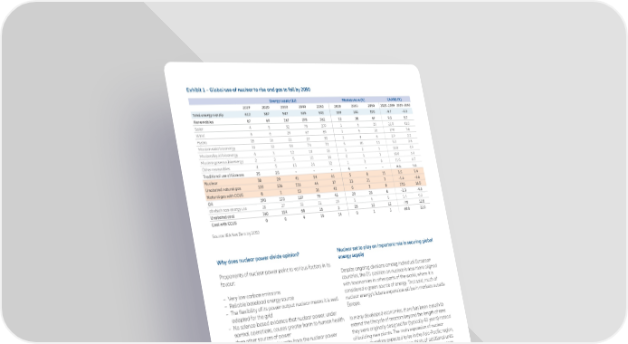 Exhibit 1 – Global use of nuclear to rise and gas to fall by 2050 Energy supply (EJ) Market share (%) CAARG (%) 2019 2020 2030 2040 2050 2020 2030 2050 2020–2030 2020–2050 Total energy supply 612 587 547 535 543 100 100 100 –0.7 –0.3 Renewables 67 69 167 295 362 12 30 67 9.3 5.7 Solar 4 5 32 78 109 1 6 20 21.0 11.0 Wind 5 6 29 67 89 1 5 16 17.0 9.6 Hydro 15 16 21 27 30 3 4 6 2.9 2.2 Modern solid bioenergy 31 32 54 73 73 5 10 14 5.3 2.8 Modern liquid bioenergy 4 3 12 14 15 1 2 3 14.0 4.9 Modern gaseous bioenergy 2 2 5 10 14 0 1 3 10.0 6.4 Other renewables 4 5 13 24 32 1 2 6 11.0 6.7 Traditional use of biomass 25 25 - - - 4 - - n.a. n.a. Nuclear 30 29 41 54 61 5 8 11 3.5 2.4 Unabated natural gas 139 136 116 44 17 23 21 3 –1.6 –6.6 Natural gas with CCUS 0 1 13 31 43 0 2 8 37.0 16.0 Oil 190 173 137 79 42 29 25 8 –2.3 –4.6 of which non-energy use 28 27 32 31 29 5 6 5 1.4 0.2 Unabated cool 160 154 68 16 3 26 12 12 –7.9 12.0 Coal with CCUS 0 0 4 16 14 0 1 3 60.0 22.0 Source: IEA Net Zero by 2050 Why does nuclear power divide opinion? Nuclear set to play an important role in securing global energy supply Proponents of nuclear power point to various factors in its favour: Despite ongoing divisions among individual European countries, the EU position on nuclear is now more aligned – V ery low carbon emissions with taxonomies in other parts of the world, where it is – R eliable baseload energy source considered a green source of energy. That said, much of – T he flexibility of its power output nuclear means it is well nuclear energy’s future expansion will be in markets outside adapted for the grid Europe. – N o science-based evidence that nuclear power, under normal operations, causes greater harm to human health In many developed economies, there has been a push to than other sources of power extend the lifecycle of reactors beyond the length of time – S trict regulation of all waste from the nuclear power they were originally designed for (typically 40 years) instead generation process of building new plants. The main expansion of nuclear – Lo w price volatility. power is therefore expected to be in the Asia-Pacific region, which looks set to account for two-thirds of additional units However, critics point to several drawbacks of nuclear over the coming years (see Exhibit 2). Over the longer term, power: China and India alone are expected to operate over 140 nuclear power reactors according to some sources. – C onstructing new nuclear power plants is technologically challenging and complex, and there is a weak track Today, there are more than 400 nuclear power plants record of keeping costs down and building new plants on around the world generating 367 gigawatts (GW) of power, time with another 57 under construction and a further 89 – D espite their very low frequency, incidents associated planned. However, between 2025-40, many existing plants with nuclear power can be extremely serious will reach the end of their planned lifetimes and will need to – P lants need to be in areas with low vulnerability to be decommissioned. physical risks – R adioactive waste has a very long lifespan and can be The resulting loss in power supply will need to be replaced difficult to store safely or the closures delayed as on their own, the new plants due – U ranium mining can have a negative impact on the to be constructed will not be sufficient to meet the target of environment. net zero emissions by 2050. As it stands, nuclear capacity is projected to hit 582 GW by 2040 – well below the 730 GW 2 required in the net-zero emissions by 2050 scenario . 1 According to a report by the European Commission’s Joint Research Centre, technologically advanced reactors are believed to have the lowest public fatality rate of all electricity production technologies. 2 According to an IEA report published in November 2021 (https://www.iea.org/reports/nuclear-power)