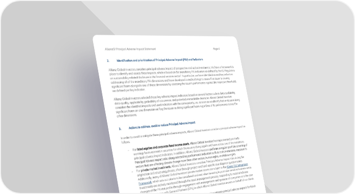 AllianzGI Principal Adverse Impact Statement Page 4 2. Identification and prioritization of Pri ncipal Adverse Impact (PAI) and Indicators Allianz Global Investors considers principal adverse impact of prospective and active investments. We have a framework in place to identify and assess those impacts , which is based on the mandatory PAI indicators as defined by the EU Regulation on sustainability - related disclosure in the financial services sector 3 . In particular, w e have identified seve ral key indicators addressing all of the mandatory PAI dimensions and have developed a methodology to assess if an issuer is causing significant harm alongside one of these dimensions by assessing the issuer’s performance against the respective thresholds we defined per key indicator . Allianz Global Investors selected those key adverse impact indicators based on several factors such as data availability, data quality, applicability, probability of occurrence, and potential irremediable character. Allianz G lobal Investors considers the identified impacts and used indicators with the same priority , i.e., as soon as we identify that an issuer is doing significant harm on one dimension we flag the issuer as doing significant harm regardless of its performance a cross the other dimensions. 3. Actions to address, avoid or reduce Principal Adverse Impact In order to avoid or mitigate these principal adverse impacts, Allianz Global Investors considers principal adverse impact as follows. – For listed equities and corporate fixed income assets , Allianz Global Investors has implemented pre - trade warnings for investment in securities for which the issuer is doing signific ant harm across one of the mandatory principal adverse impact indicators. In addition, Allianz Global Investors performs a regular portfolio screening of Principal Adverse Impact risks along selected key performance indicators such as carbon emissions, exposure to sectors that are affecting climate change more than other sectors, human rights, and labour rights. – For private market investments , Allianz Global Investors considers Principal Adverse Impact risks during the origination and structuring phases , often through project and fund - specific due diligence questionnaires. Additionally, many of Allianz Global Investors’ private market as sets are subject to the Allianz ESG Integration Framework , which sets out criteria to be considered and met when investing in particular sensitive business areas. Investments are actively monitored through the asset management process, responding to material adverse changes of the PAI risk profile through engagement with management and sponsors of companies or in the case of indirect strategies with General Par tners ( GPs ) , in which Allianz Global Investors invests on b ehalf of our clients. In addition, Allianz Global Investors takes several actions to address, avoid or mitigate principal adverse impacts for liste d equities and corporate fixed income assets, including: ▪ Restricting investments - This covers: (1) exclusion of companies producing or associated with controversial weapons ; 4 and (2) Restriction of sanctioned sovereigns 5 . Allianz G lobal Investors has implemented a new global exclusion policy which cover s coal 6 and an extended scope of controversial weapons 7 . Further details can be found in our Exclusion Policy . 3 https://ec.europa.eu/info/business - economy - euro/banking - and - finance/sustainable - finance/sustainability - related - disclosure - financial - services - sector_en 4 Allianz Global Investors has put in place processes to identify and document the compani es that are to be excluded from investment based on the above - described criteria. This is applicable to mutual funds for which Allianz Global Investors is acting as management company. For institutional fund s and mandates, application of the criteria is s ubject to the consent of the respective clients. 5 Allianz Global Investors GmbH is highly committed to fully adhere to the various relevant Embargos and Economic Sanctions regulations as this regards our clients, employees, vendors and investments in our funds. 6 companies that derive more than 30% of their annual revenue from thermal coal extraction, and companies deriving more than 30 % of their electricity production from coal 7 companies involved in the development, production, use, maintenance, offering for sale, distribution, import or export, stora ge or transportation of: Anti - personnel mines, Cluster munitions, Biological weapons, Chemical weapons, Nuclear weapons outside of NPT (non - proliferation treaty), Depleted uranium weapons