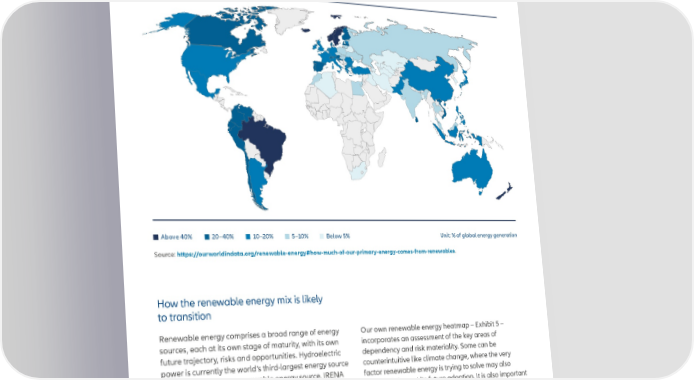 RENEWABLE ENERGY: THE 2050 REMIX Developed countries have directed policy support to at their disposal. To address this point, the International renewable energy through subsidies and 昀椀scal stimulus Renewable Energy Agency (IRENA) has proposed the idea packages like the In昀氀ation Reduction Act in the US and of a transfer mechanism, whereby developed countries the European Green Deal Industrial Plan. However, most can support developing countries. Exhibit 3 shows the developing economies do not have the same 昀椀scal tools concentration of renewable energy capacity globally. Exhibit 3: Share of primary renewable energy in the energy mix by location in 2021 Above 40% 20–40% 10–20% 5–10% Below 5% Unit: % of global energy generation Source: https://ourworldindata.org/renewable-energy#how-much-of-our-primary-energy-comes-from-renewables. How the renewable energy mix is likely to transition Renewable energy comprises a broad range of energy Our own renewable energy heatmap – Exhibit 5 – sources, each at its own stage of maturity, with its own incorporates an assessment of the key areas of future trajectory, risks and opportunities. Hydroelectric dependency and risk materiality. Some can be power is currently the world’s third-largest energy source counterintuitive like climate change, where the very and by far the largest renewable energy source. IRENA factor renewable energy is trying to solve may also estimates that it will account for 37% of renewables, equal negatively impact its future adoption. It is also important to 1,250GW, by the end of 2022 (solar: 31%; wind: 27%). to understand the extent to which future development However, by 2050 while we expect hydroelectric power is a function of processes, technologies and enabling to have increased slightly, its share of the overall and infrastructure (grids and grid connections) that do not renewable energy mixes is expected to have fallen sharply. currently exist. Some of these factors may be subject Solar and wind are expected to be the leading sources of to political volatility to the extent that progress may be energy in the renewables mix – see Exhibit 4. policy-related (eg, reducing the delay on permits). 3