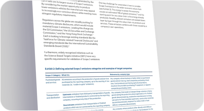 POWER OF 3: WHY SCOPE 3 EMISSIONS MATTER Why do Scope 3 emissions matter? reduction targets. These requirements include a full GHG inventory of emissions, including Scope 3 emissions Scope 3 emissions account for over 70% of the average coverage of at least 67% for any near-term targets9 2 10 company’s total emissions. This highlights why, in our and 90% for long-term targets. With more than 5,600 11 view, addressing Scope 3 is key to reaching net zero by companies looking to take action in line with SBTi, 2050,3 thus limiting global warming to 1.5°C. Furthermore, there is clear momentum to tackle this topic. we believe that addressing Scope 3 emissions will help individual companies better mitigate the risks and seize Challenges for corporates the opportunities of the climate transition. Take the example of a car manufacturer. The emissions generated by the One key challenge for corporates is how to consider cars it sells are its largest source of Scope 3 emissions. Scope 3 emissions in the wider economic value chain By considering the market opportunity to produce (see Exhibit 3). The energy to power the economy 12 lower-emissions vehicles the manufacturer may appeal causes an estimated 73% of global emissions, and the to increasingly eco-conscious drivers while meeting more starting point for any value chain is the energy already stringent regulatory requirements. produced. Steadily, relevant emissions are passed down layer by layer through the value chain via products and Regulators across the globe are steadily pushing for services. These emissions combine with those caused by a mandatory climate disclosures, which would include company’s own operations. material Scope 3 emissions. Leading this charge are 4 the EU Commission, the US Securities and Exchange Commission,5 and the Hong Kong Stock Exchange.6 Each is looking to leverage existing standards like the 7 Taskforce for Climate-related Financial Disclosures and emerging standards like the International Sustainability Standards Board (ISSB).8 Furthermore, widely recognised initiatives such as the Science Based Targets initiative (SBTi) have very speci昀椀c requirements for validation of Scope 3 emissions Exhibit 2: De昀椀ning selected Scope 3 emissions categories and examples of target companies Scope 3 Category What it is Relevance by company type Purchased goods All emissions occurring in the production of goods and services Any company whose business is highly reliant on purchased and services purchased by the reporting company, up to the sourcing of raw goods and services eg, steel companies purchasing mined materials (ie, “cradle-to-gate” emissions). ores, food producers purchasing agricultural products, cloud service providers purchasing IT equipment, or apparel companies purchasing cotton. Transportation Upstream: emissions from third-party transportation of goods, Any company that needs to transport large volumes or heavy and distribution intermediate or 昀椀nished products contracted by the reporting goods during the production phase (upstream) or for 昀椀nished company, occurring at any step of the production. goods (downstream) eg, automotive manufacturers to bring sub-parts for 昀椀nal assembly (upstream), construction materials Downstream: emissions from transportation of 昀椀nished (up and downstream), shipment for online retail or food products which are not contracted by the reporting company. delivery companies (downstream). Use of sold Emissions either directly emitted or from the energy Any company whose products either directly emit GHGs or products consumption (fuel or power) over the entire use phase of consume energy in their use phase eg, fuel producers for the products sold by the reporting company. emissions from burning the fuels, car makers for the emissions derived from the energy to run the car (fuel for combustion engines or electricity for electric vehicles), any vendor of electrical appliances for emissions linked to their power consumption, food producers for emissions linked to energy to process food (cooking). Source: Allianz Global Investors and GHG Protocol Corporate Value Chain (Scope 3) Accounting Reporting Standard 3
