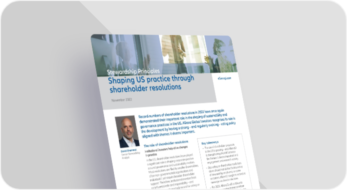 Shaping US practice through shareholder resolutions Allianz Global Investors is a leading active asset manager with over 600 investment professionals in over 20 offices worldwide and managing EUR 578 billion in assets. We invest for the long term and seek to generate value for clients every step of the way. We do this by being active – in how we partner with clients and anticipate their changing needs, and build solutions based on capabilities across public and private markets. Our focus on protecting and enhancing our clients’ assets leads naturally to a commitment to sustainability to drive positive change. Our goal is to elevate the investment experience for clients, whatever their location or objectives. Active is: Allianz Global Investors Data as at 30 June 2022. On 25 July 2022, AllianzGI completed the transfer of investment teams (including 87 Investment Professionals) and USD 101bn of assets they manage to Voya Investment Management as part of a strategic partnership. Two thirds of the assets continue to be managed on behalf of AllianzGI clients outside of the US. Investing involves risk. The value of an investment and the income from it will fluctuate and investors may not get back the principal invested. Past performance is not indicative of future performance. This is a marketing communication. It is for informational purposes only. This document does not constitute investment advice or a recommendation to buy, sell or hold any security and shall not be deemed an offer to sell or a solicitation of an offer to buy any security. The views and opinions expressed herein, which are subject to change without notice, are those of the issuer or its affiliated companies at the time of publication. Certain data used are derived from various sources believed to be reliable, but the accuracy or completeness of the data is not guaranteed and no liability is assumed for any direct or consequential losses arising from their use. The duplication, publication, extraction or transmission of the contents, irrespective of the form, is not permitted. This material has not been reviewed by any regulatory authorities. In mainland China, it is for Qualified Domestic Institutional Investors scheme pursuant to applicable rules and regulations and is for information purpose only. This document does not constitute a public offer by virtue of Act Number 26.831 of the Argentine Republic and General Resolution No. 622/2013 of the NSC. This communication’s sole purpose is to inform and does not under any circumstance constitute promotion or publicity of Allianz Global Investors products and/or services in Colombia or to Colombian residents pursuant to part 4 of Decree 2555 of 2010. This communication does not in any way aim to directly or indirectly initiate the purchase of a product or the provision of a service offered by Allianz Global Investors. Via reception of his document, each resident in Colombia acknowledges and accepts to have contacted Allianz Global Investors via their own initiative and that the communication under no circumstances does not arise from any promotional or marketing activities carried out by Allianz Global Investors. Colombian residents accept that accessing any type of social network page of Allianz Global Investors is done under their own responsibility and initiative and are aware that they may access specific information on the products and services of Allianz Global Investors. This communication is strictly private and confidential and may not be reproduced. This communication does not constitute a public offer of securities in Colombia pursuant to the public offer regulation set forth in Decree 2555 of 2010. This communication and the information provided herein should not be considered a solicitation or an offer by Allianz Global Investors or its affiliates to provide any financial products in Brazil, Panama, Peru, and Uruguay. In Australia, this material is presented by Allianz Global Investors Asia Pacific Limited (“AllianzGI AP”) and is intended for the use of investment consultants and other institutional/professional investors only, and is not directed to the public or individual retail investors. AllianzGI AP is not licensed to provide financial services to retail clients in Australia. AllianzGI AP is exempt from the requirement to hold an Australian Foreign Financial Service License under the Corporations Act 2001 (Cth) pursuant to ASIC Class Order (CO 03/1103) with respect to the provision of financial services to wholesale clients only. AllianzGI AP is licensed and regulated by Hong Kong Securities and Futures Commission under Hong Kong laws, which differ from Australian laws. This document is being distributed by the following Allianz Global Investors companies: Allianz Global Investors U.S. LLC, an investment adviser registered with the U.S. Securities and Exchange Commission; Allianz Global Investors Distributors LLC, distributor registered with FINRA, is affiliated with Allianz Global Investors U.S. LLC; Allianz Global Investors GmbH, an investment company in Germany, authorized by the German Bundesanstalt für Finanzdienstleistungsaufsicht (BaFin); Allianz Global Investors (Schweiz) AG; in HK, by Allianz Global Investors Asia Pacific Ltd., licensed by the Hong Kong Securities and Futures Commission; in Singapore, by Allianz Global Investors Singapore Ltd., regulated by the Monetary Authority of Singapore [Company Registration No. 199907169Z]; in Japan, by Allianz Global Investors Japan Co., Ltd., registered in Japan as a Financial Instruments Business Operator [Registered No. The Director of Kanto Local Finance Bureau (Financial Instruments Business Operator), No. 424], Member of Japan Investment Advisers Association, the Investment Trust Association, Japan and Type II Financial Instruments Firms Association; in Taiwan, by Allianz Global Investors Taiwan Ltd., licensed by Financial Supervisory Commission in Taiwan; and in Indonesia, by PT. Allianz Gl