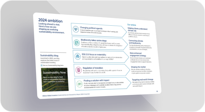2024 ambition Our actions Looking ahead is vital. Helping clients understand Here’s how we are Changing political agenda climate risk shaping an evolving A record election year could lead to delays in the 昀椀nancing and Our risklab advisory team examines how sustainability environment. implementation of transition plans. di昀昀erent climate scenarios could impact portfolio returns. Biodiversity takes centre stage Connecting climate Taskforce on Nature-related Financial Disclosures and Corporate and biodiversity Sustainability Reporting Directive will help accelerate the integration Our new biodiversity policy statement is of biodiversity into investment processes. essential to formally integrate biodiversity considerations into our strategies. Data-enhanced Sustainability blog ESG 2.0: focus on materiality engagement strategy Higher-quality data and new methods to capture the material risks Across all asset classes our investment Launched in 2023, our blog and opportunities will rede昀椀ne the concept of ESG.8 professionals can now access more explores the latest issues in engagement data to support decisions. sustainable investing. See our Sustainability blog here. Shaping the market Regulation of transition Regulations will continue to evolve, likely with a greater focus on We are already working to develop, Sustainability Now transition 昀椀nance for the EU and UK. build and propose transition strategies in both public and private markets. Read our new blog for fresh takes on sustainable investing – from renewables to rewilding. Finding a solution with impact Targeting real-world change Public markets start to incorporate concepts from private markets We explore how best to develop credible to solve challenges with scalable solutions that bring positive and robust public market strategies with environmental and social impacts. real-world impact. Allianz Global Investors Sustainability and Stewardship Report 2023: Snapshot 03